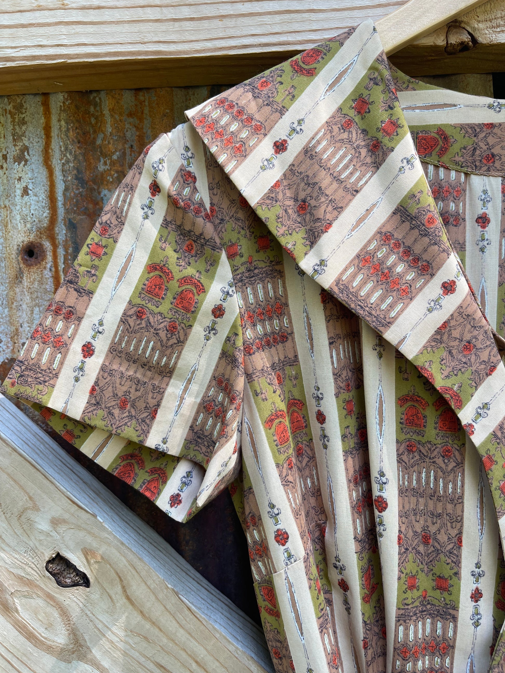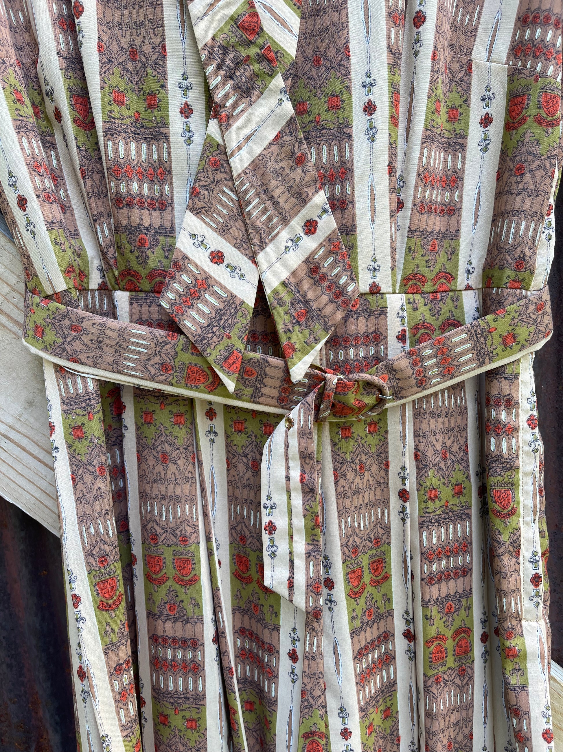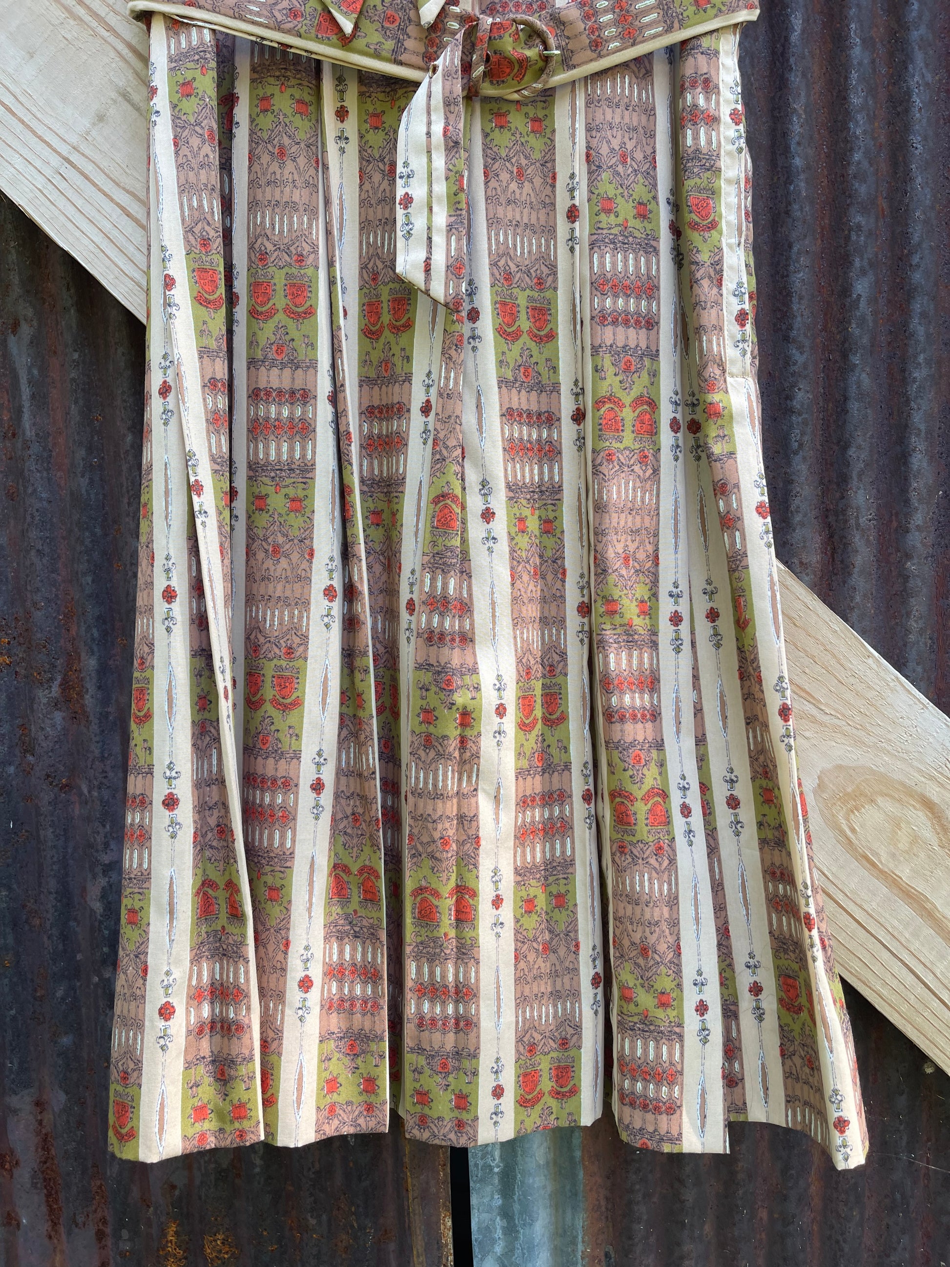 This gorgeous 50/60s novelty is one of a kind. The collar, belt, pleated bottom. Seems to be cotton, but handmade and no tags to affirm nor deny.