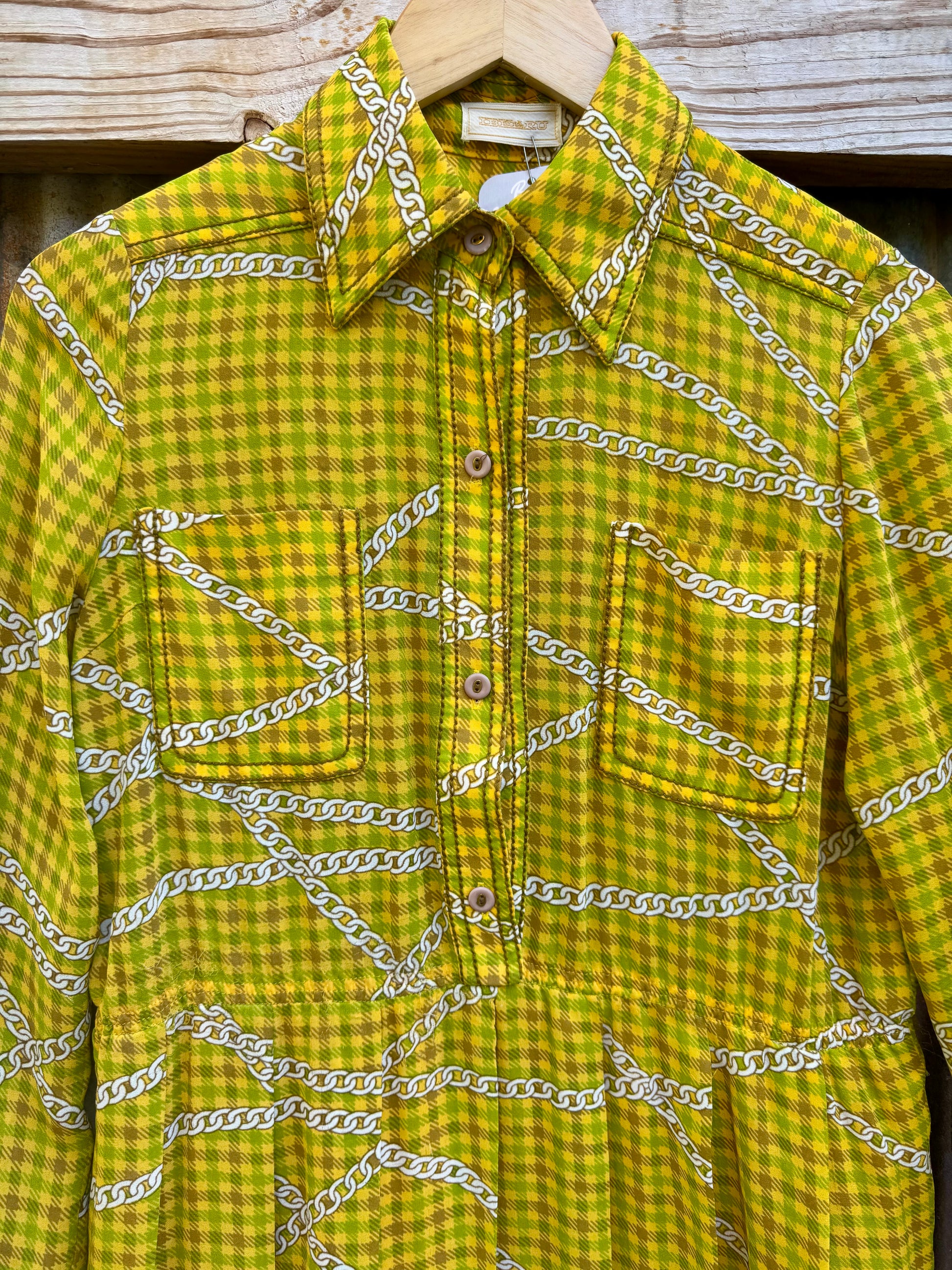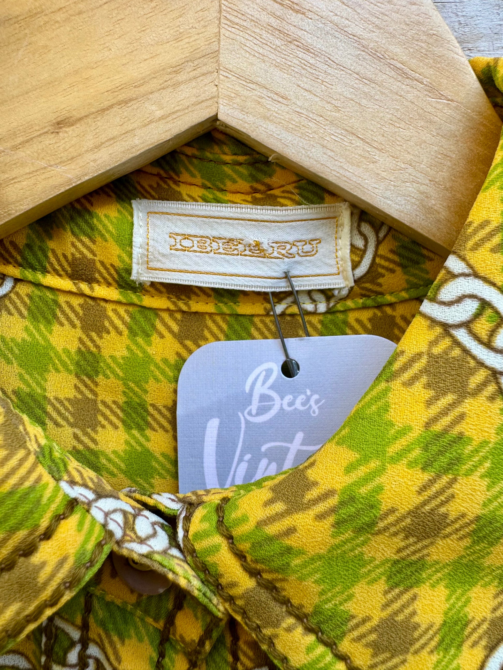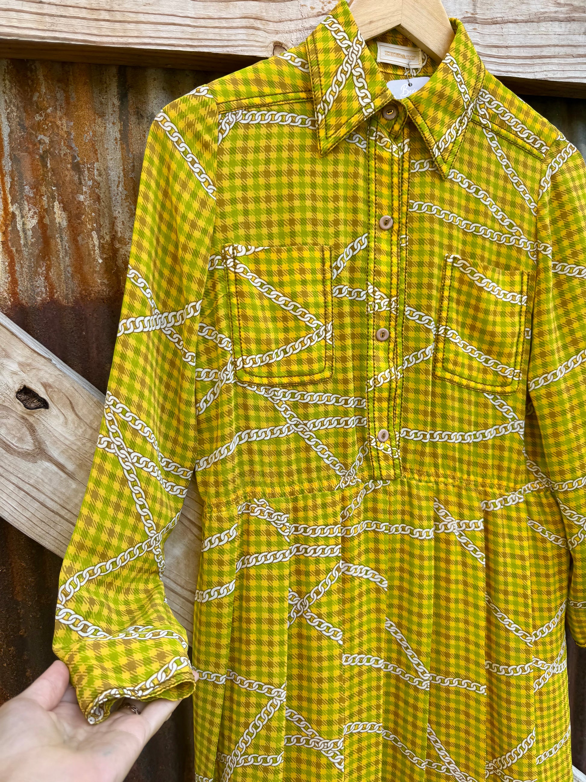 1960s Ibeeru vintage dress with a stunning color palette. A chain design, yellow, green and brown plaid. Elastic waist that allows for a little stretch. Skirt is fully lined & pleated. No fabric tags but appears to be polyester. Has subtle signs of wearing in elastic. Two front chest pockets & button closure down bodice