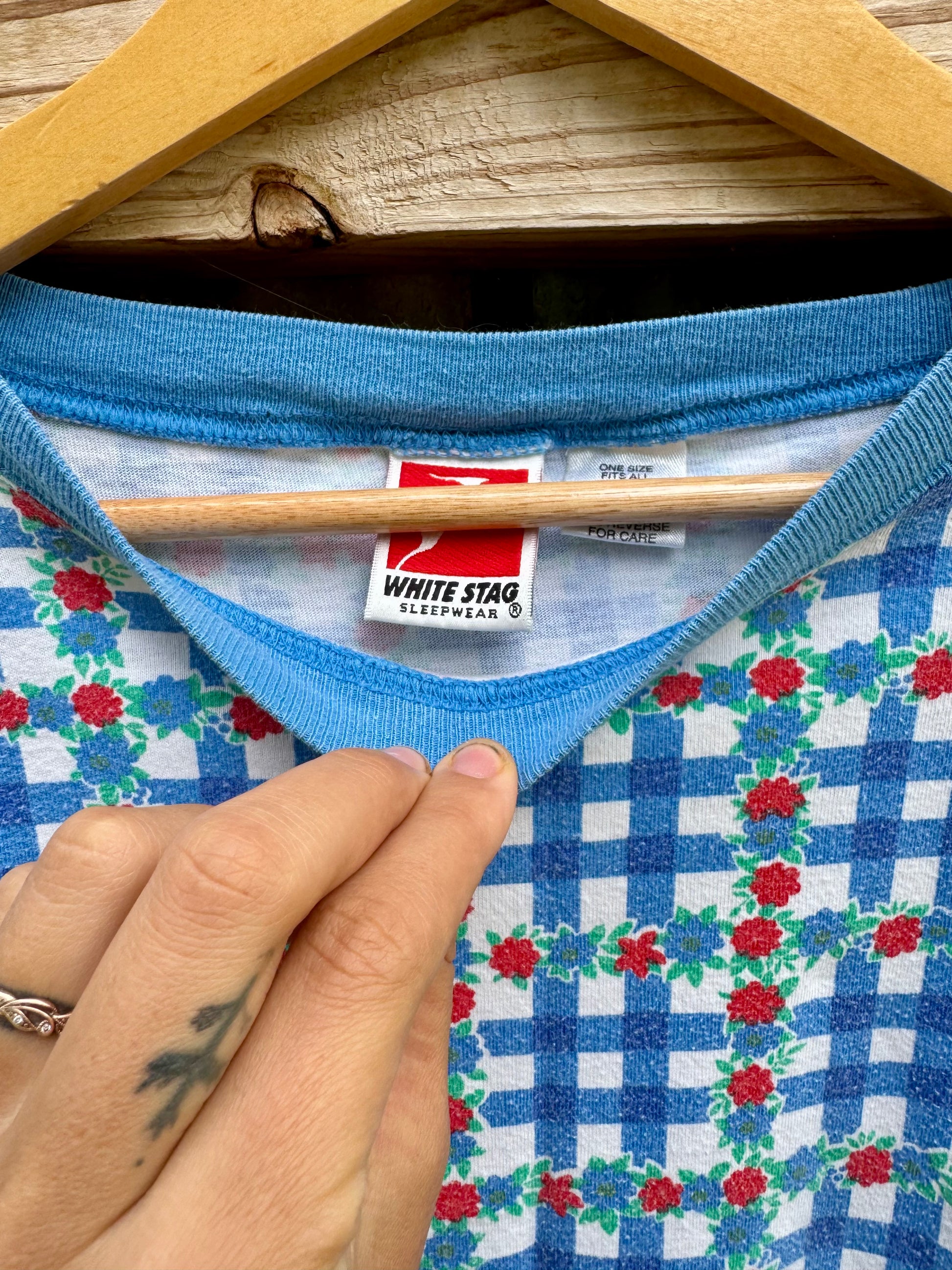100% cotton White Stag sleep dress. Red and blue floral gingham pattern throughout. Pull over.