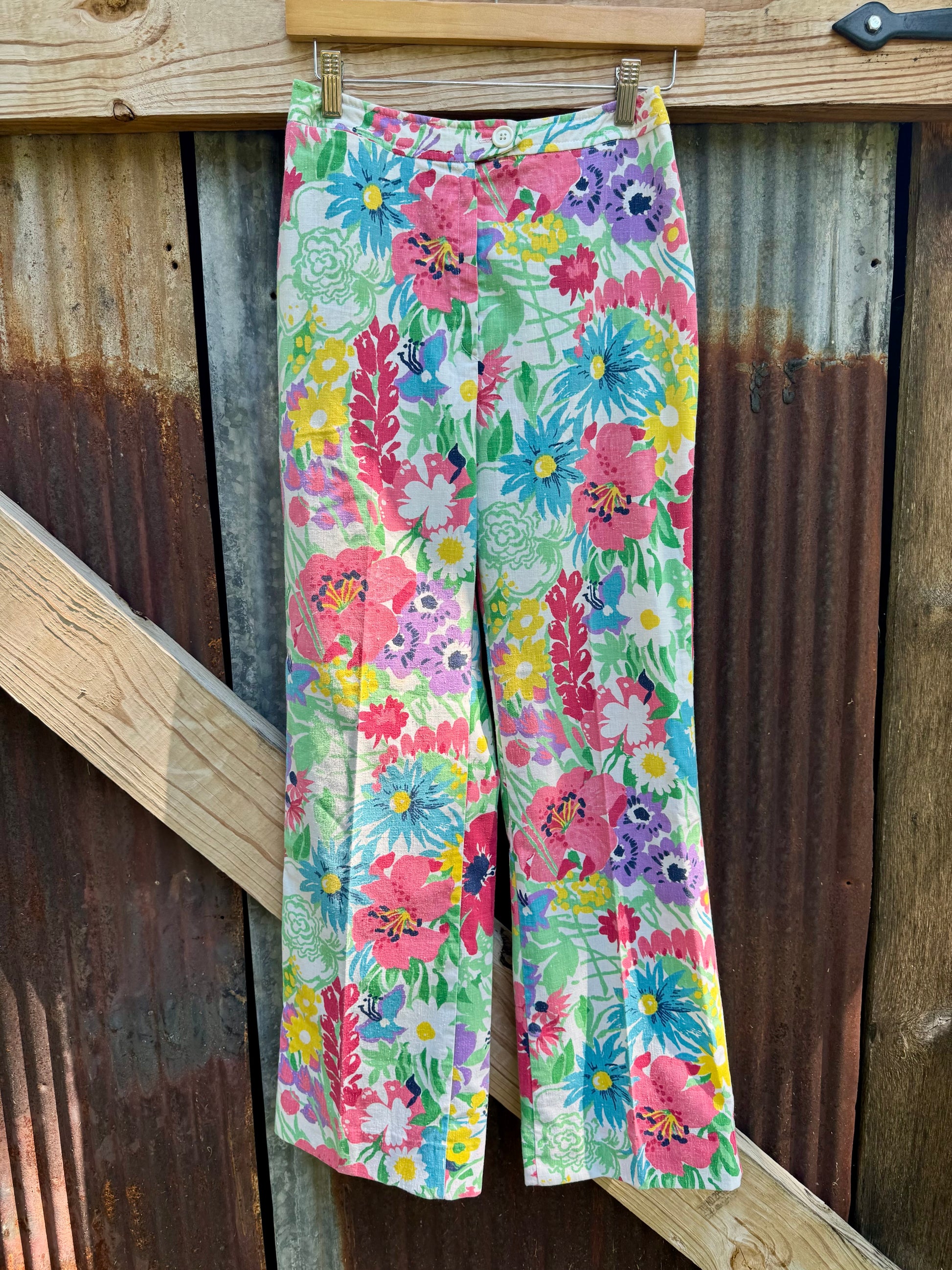 60-70s floral trousers by Kathleen Arnold Activair. Gorgeous floral design. Front button and zip closure. Perfect for work or play. No fabric tag, but feels like a cotton/poly blend.