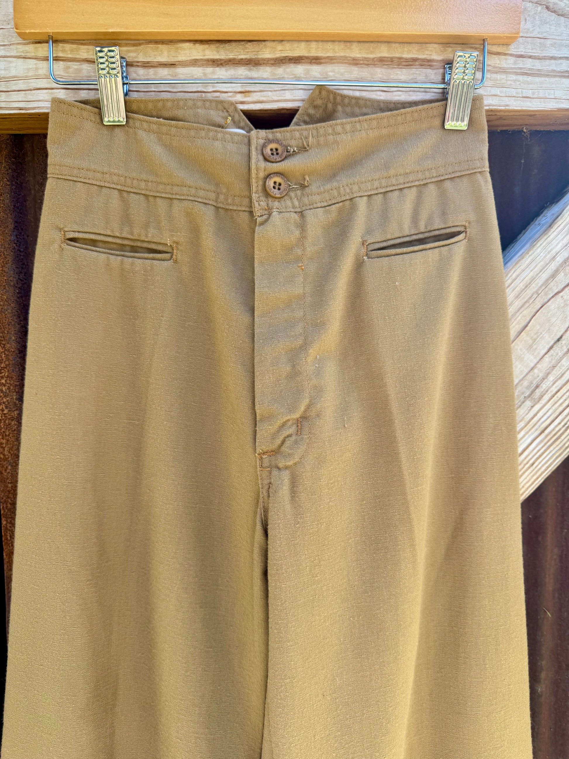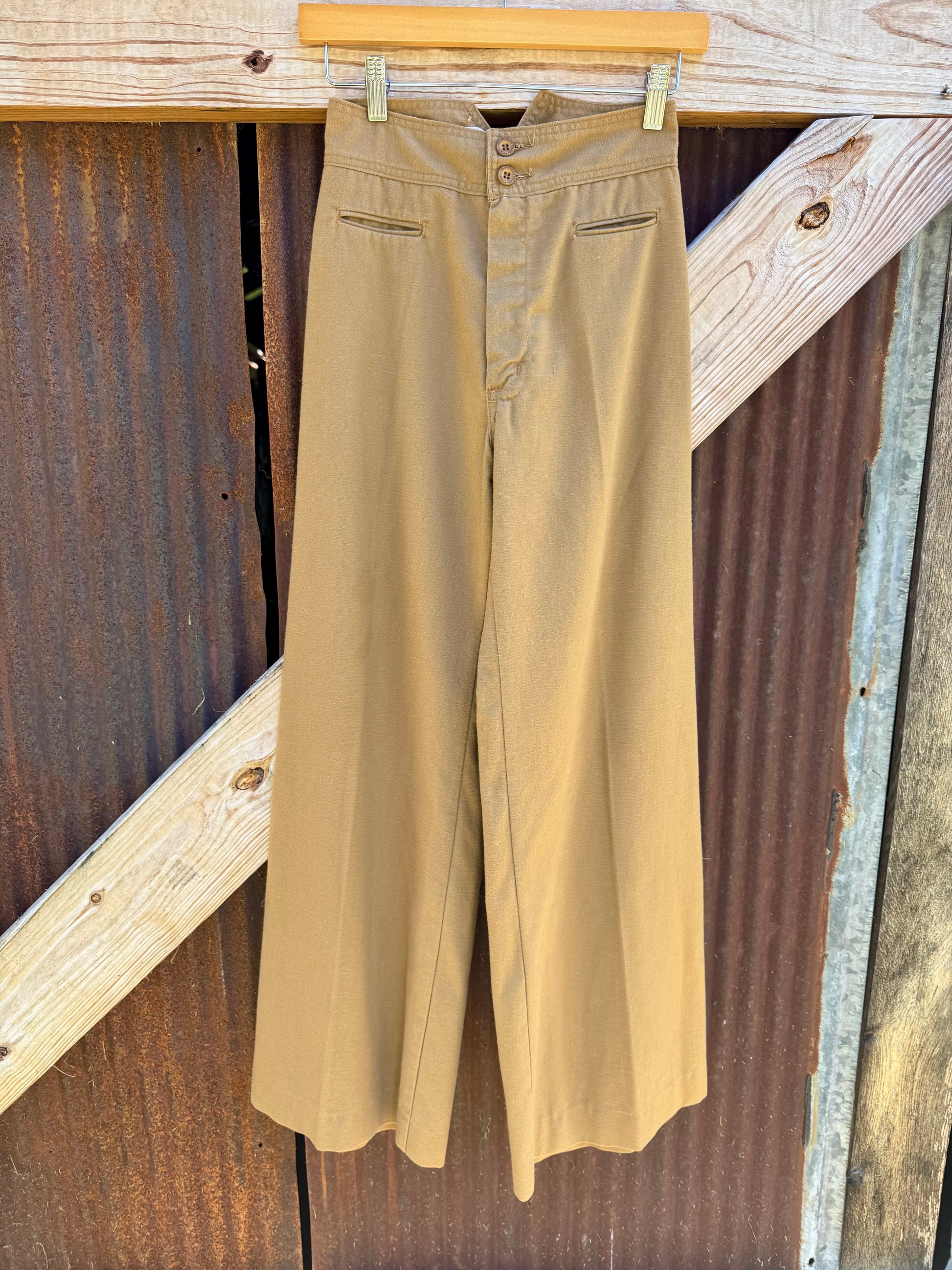 Insane 1970 buckle back Plushbottoms. No signs of wear. Dark khaki in color, wide leg trouser. Double button and zipper for closure. 100% cotton.