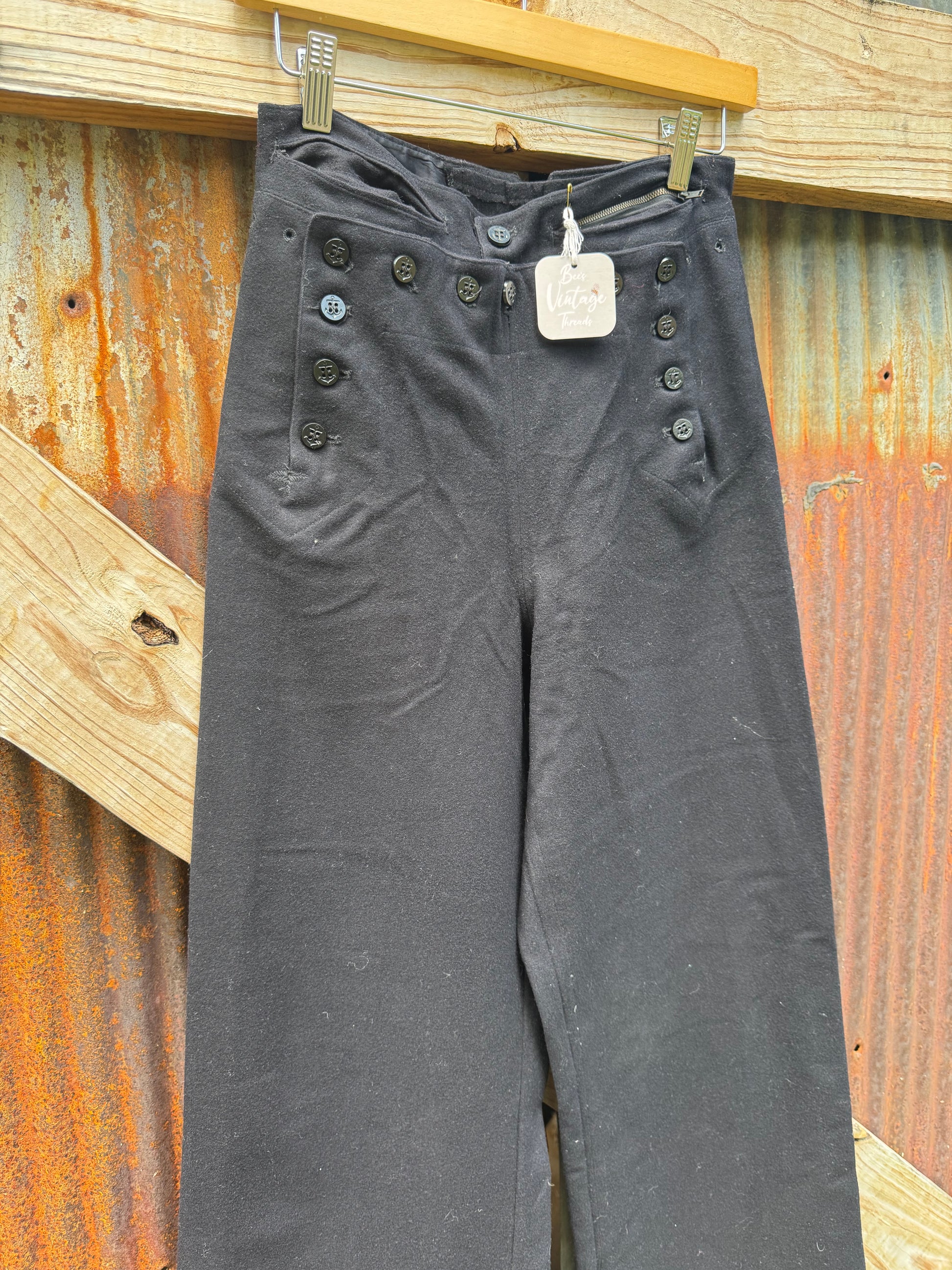 Beautiful black wool sailors. Please forgive the fuzz. Photographing these stunners is quite hard. They are perfectly dark black 40s wool sailor pants. Lace up back waist and front buttons as shown. In absolute pristine vintage condition. Wide legs.