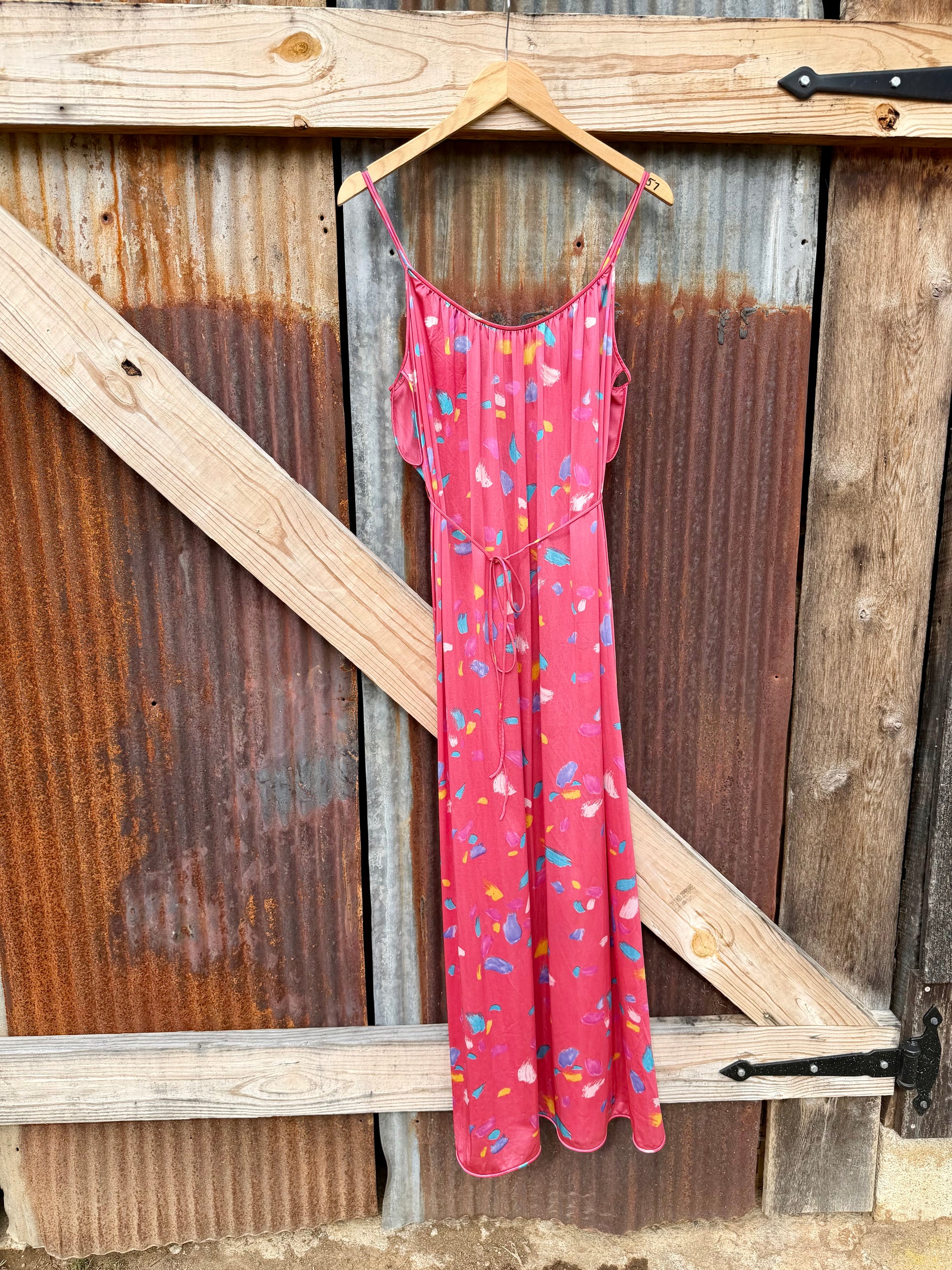 Hot pink 1980s night gown or slip. Easily could be styled as a dress. Nylon material with waist tie & sweet openings under the arm.