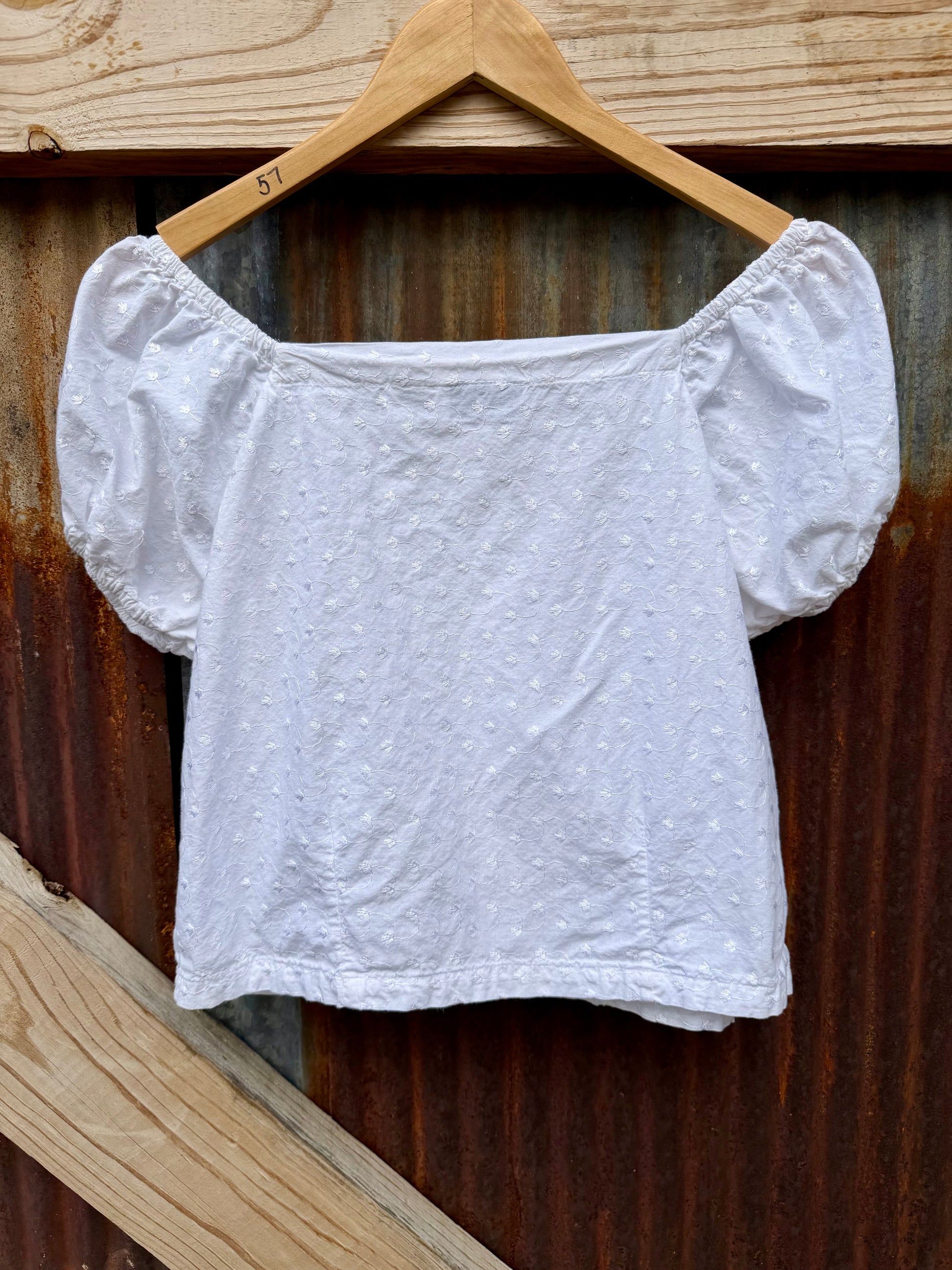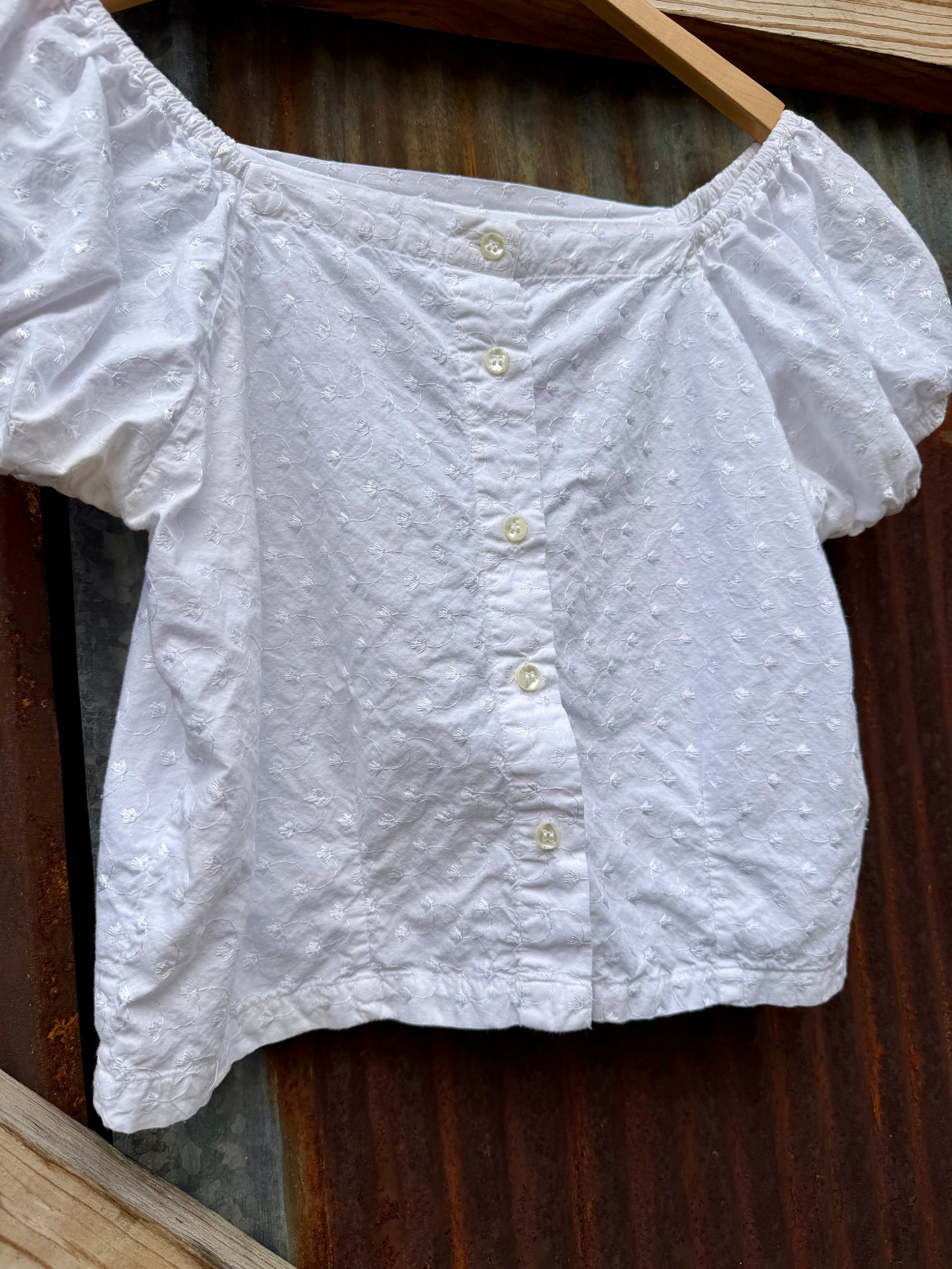 100% cotton eyelet vintage top by Honors. Perfect in every way. Button down front closure. Puff sleeves can sit on or off the shoulder.