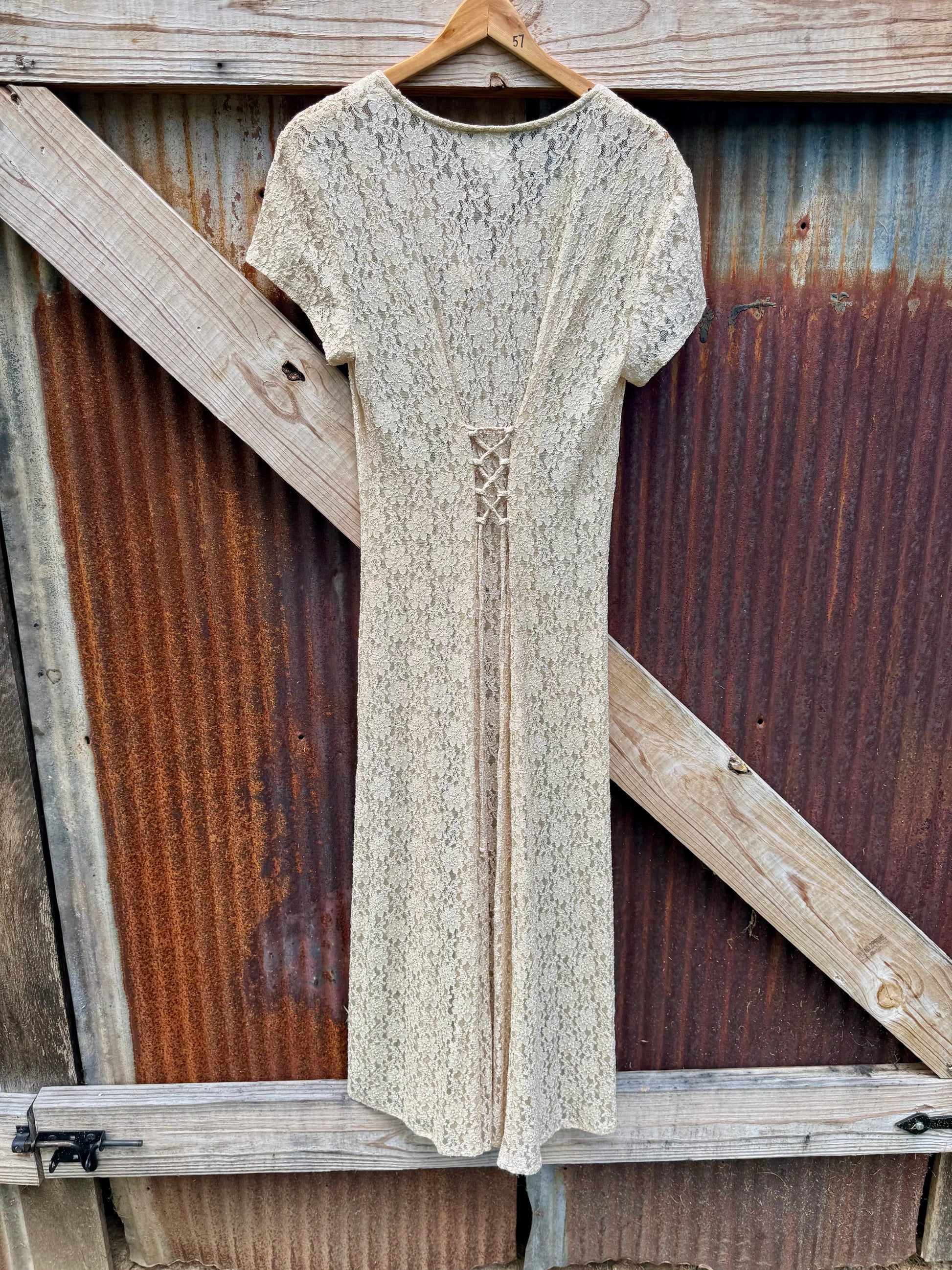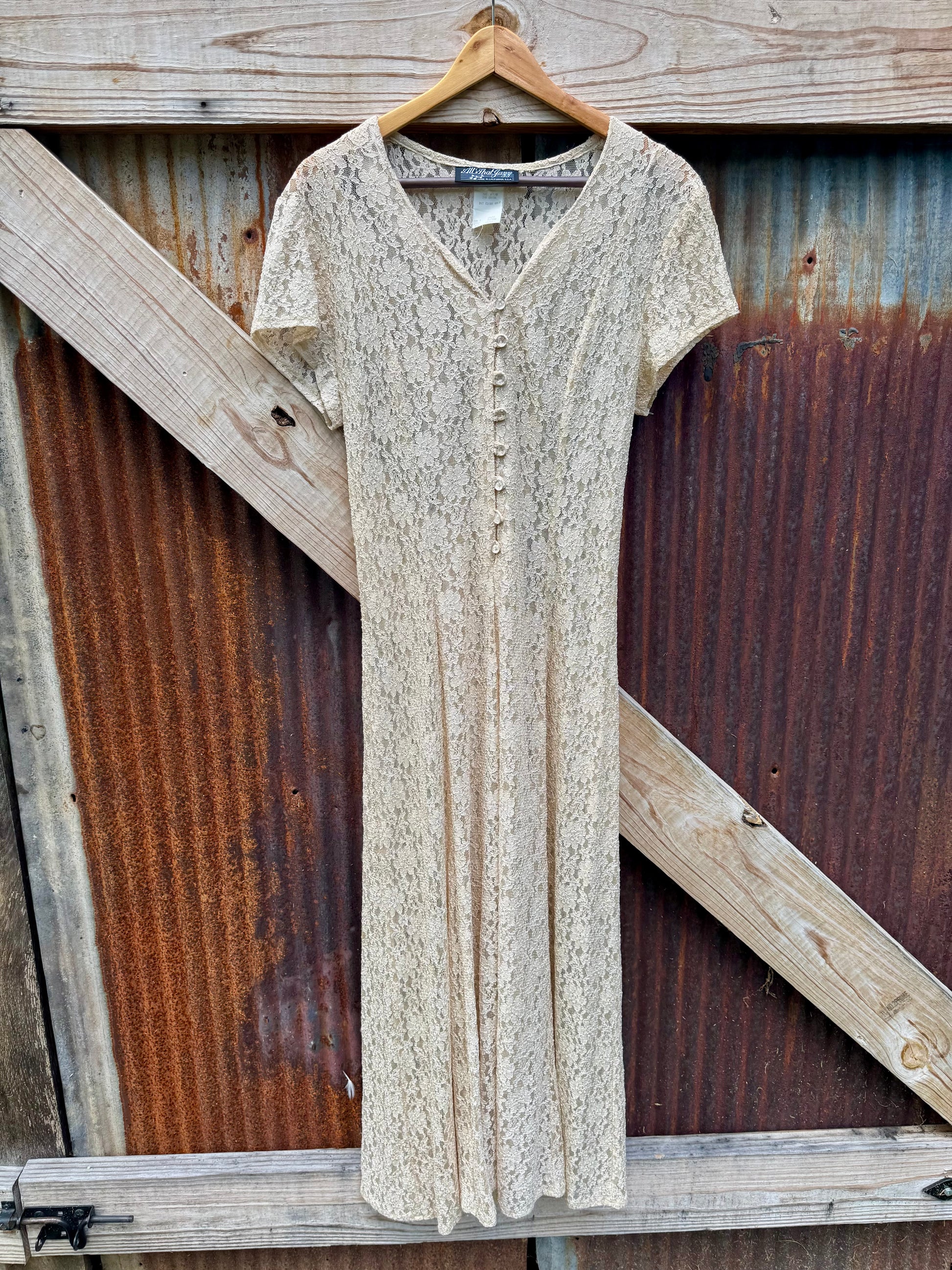 1990s creamy All That Jazz lace maxi. Cute diamond like buttons 11" down the front of the dress. Laces up the back for a cinched look.