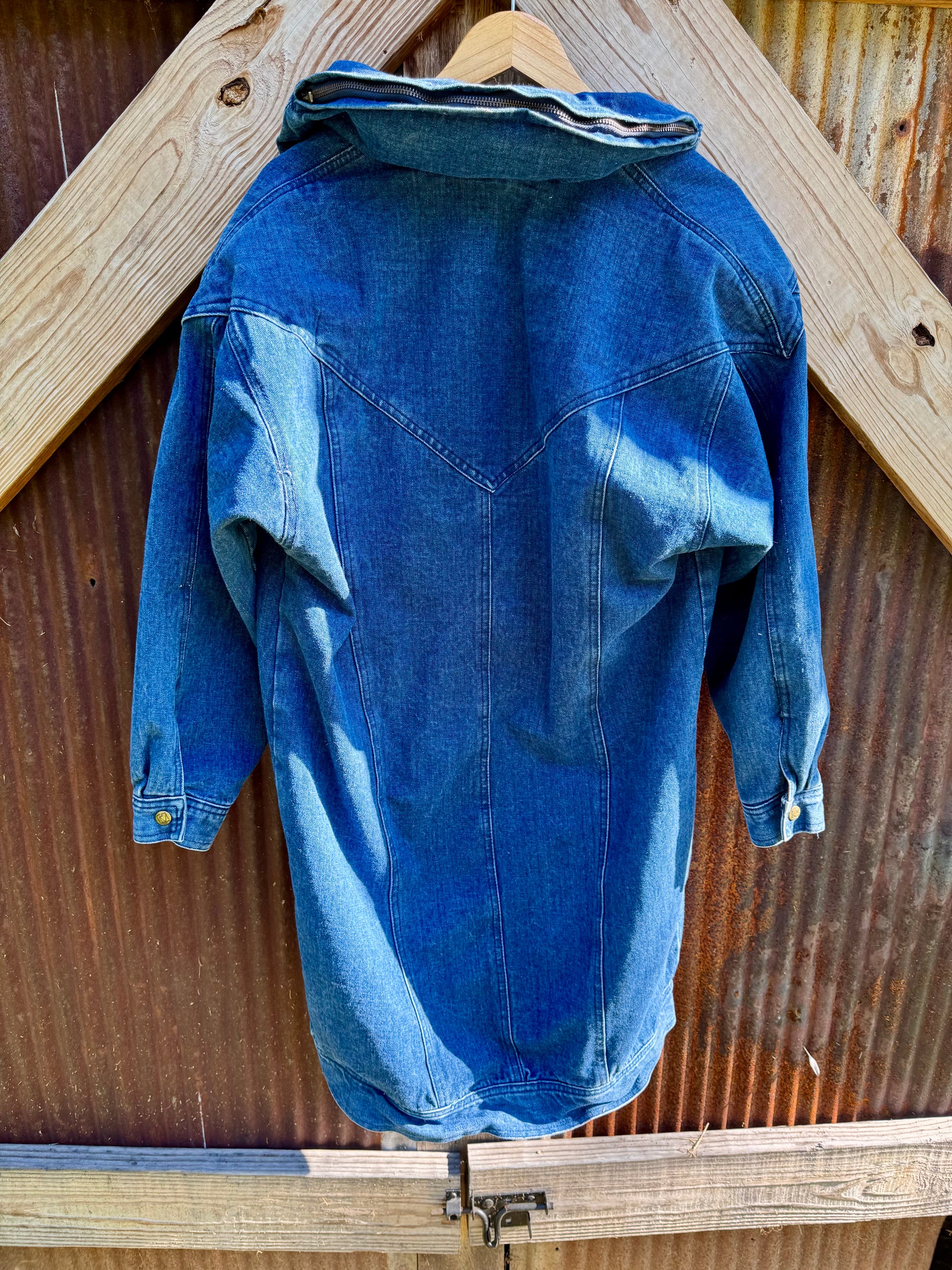 Dark wash denim Andy Johm's denim parka style jacket. Completely flannel lined with a map design. Snap button front closure. Large pockets. And a hideaway hood in collar.