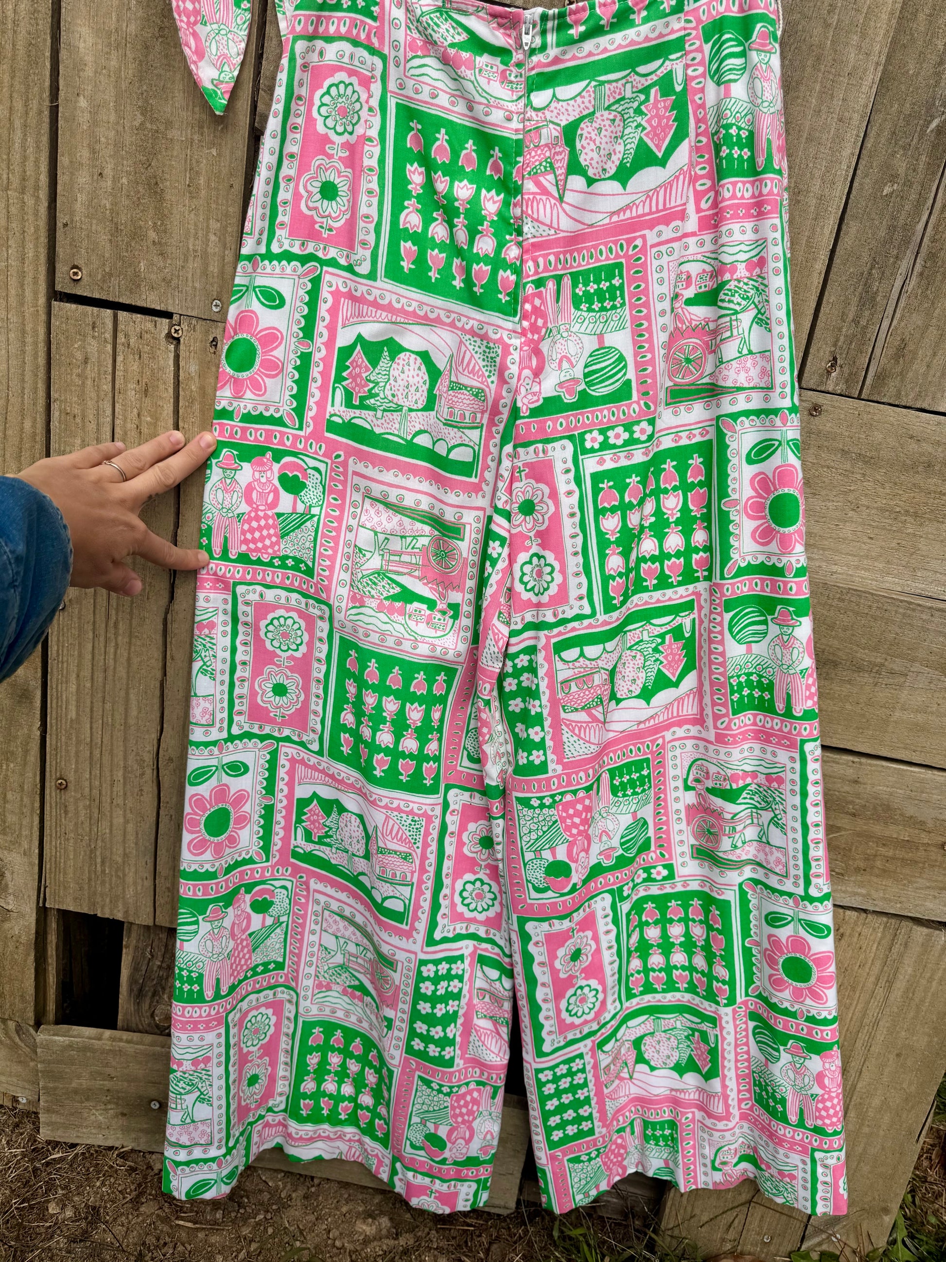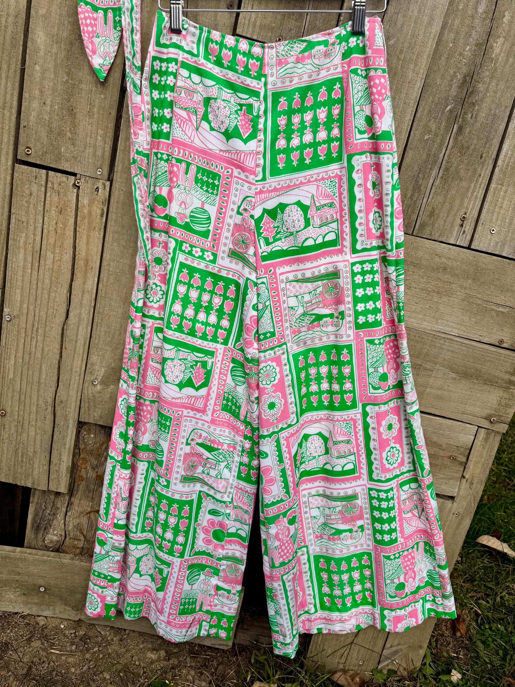 Vintage, what seem to be cotton, 1960/70s Novelty print wide leg pants by 'Ah! Austin Hill.' Lined with a cotton fabric Hem can be let out if desired to be longer.