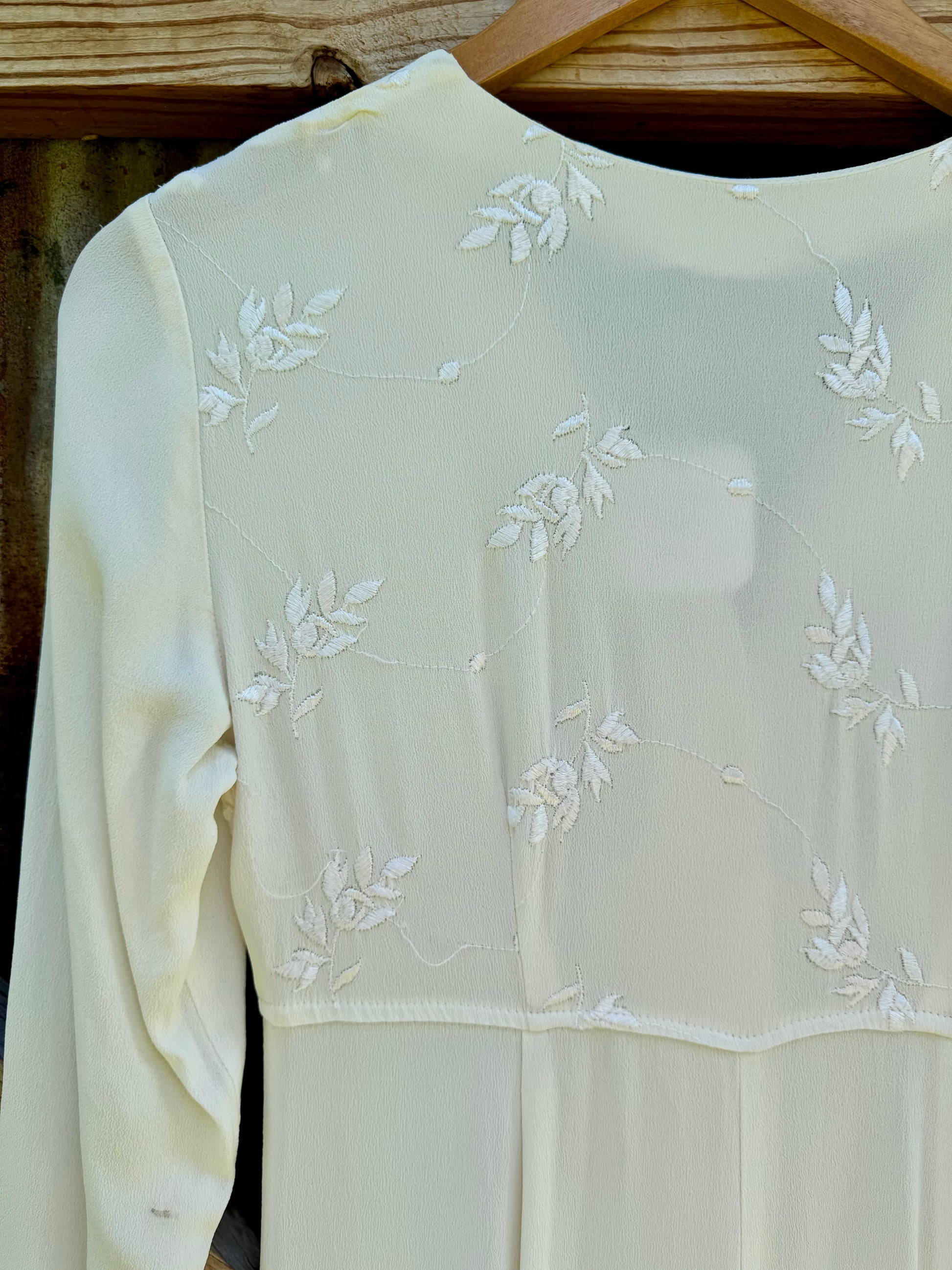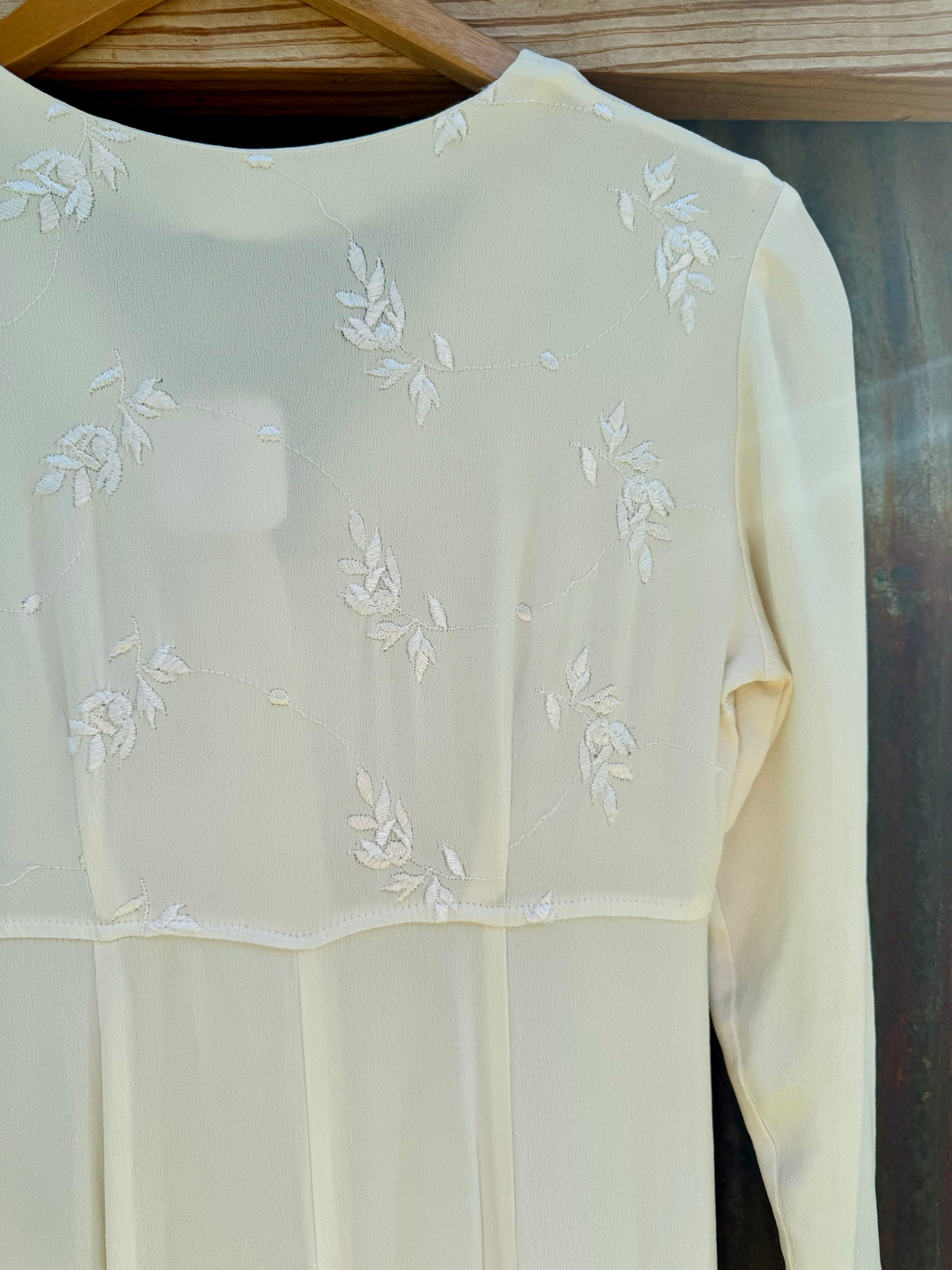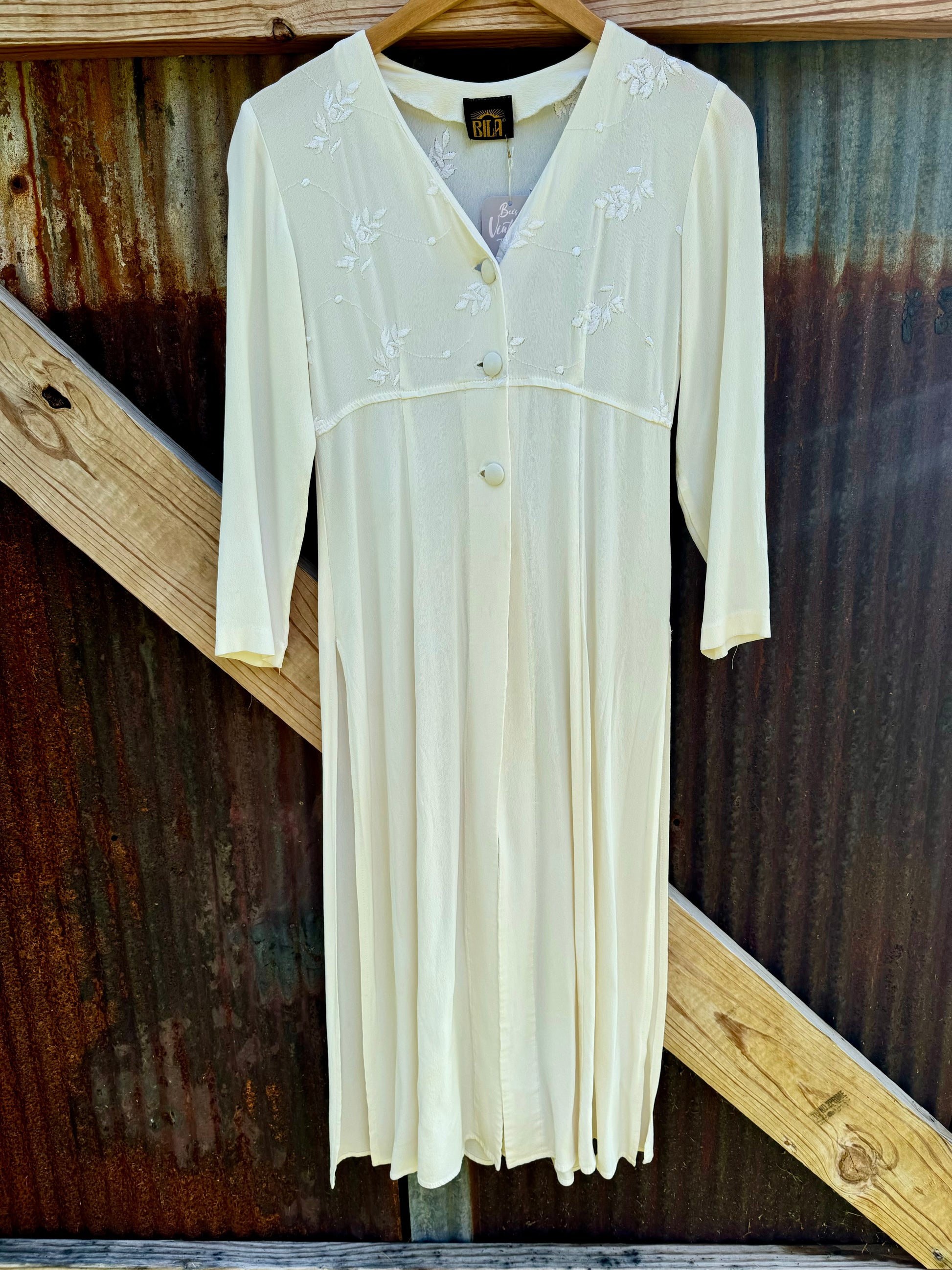 80s floral rayon duster. I can imagine this as one half of a gorgeous set. Lovely embroidered flowers throughout the front & back of bodice. A few minor snags but nothing that affects wear. 3 button closure on the bodice with a gorgeous flow to the bottom half.