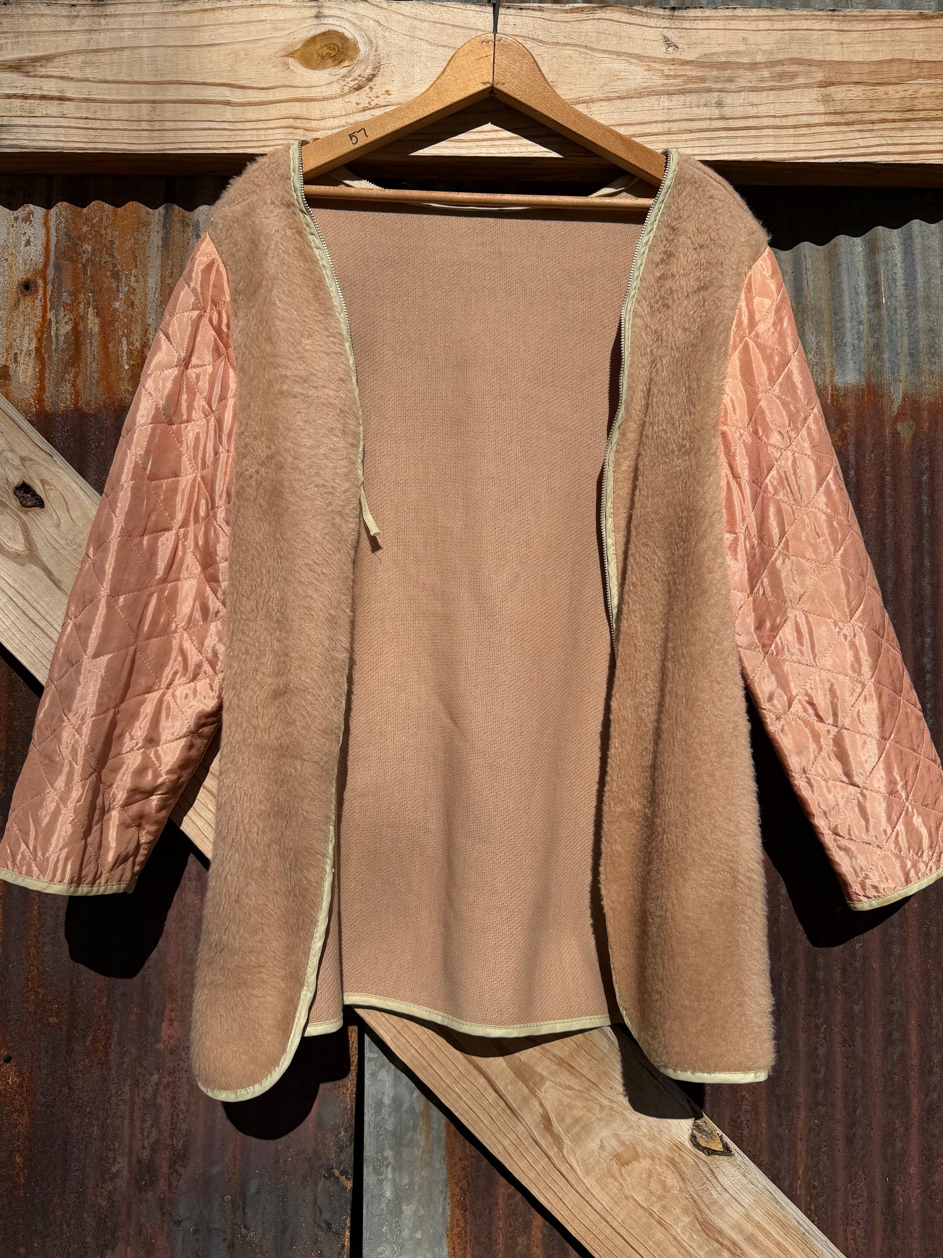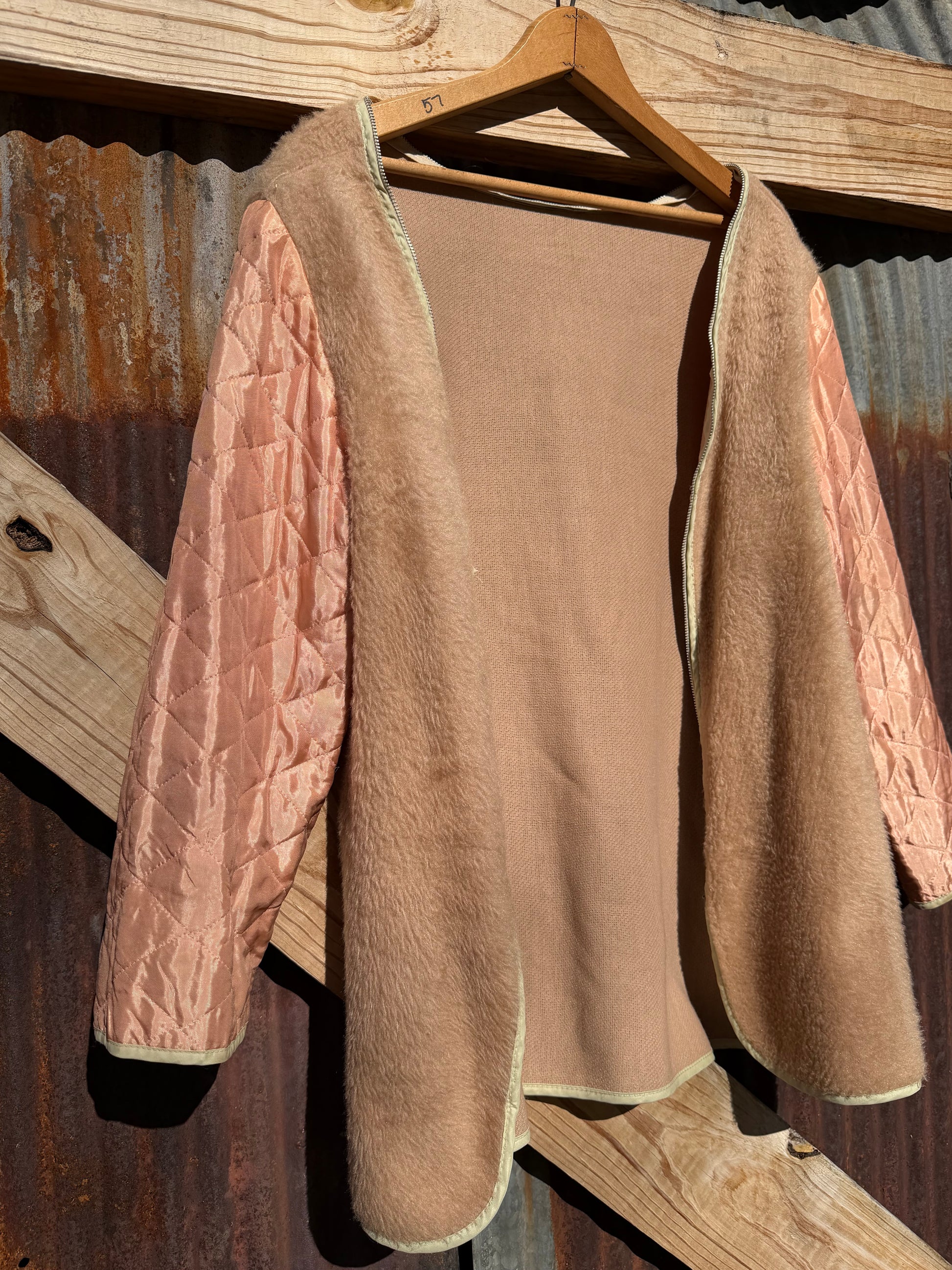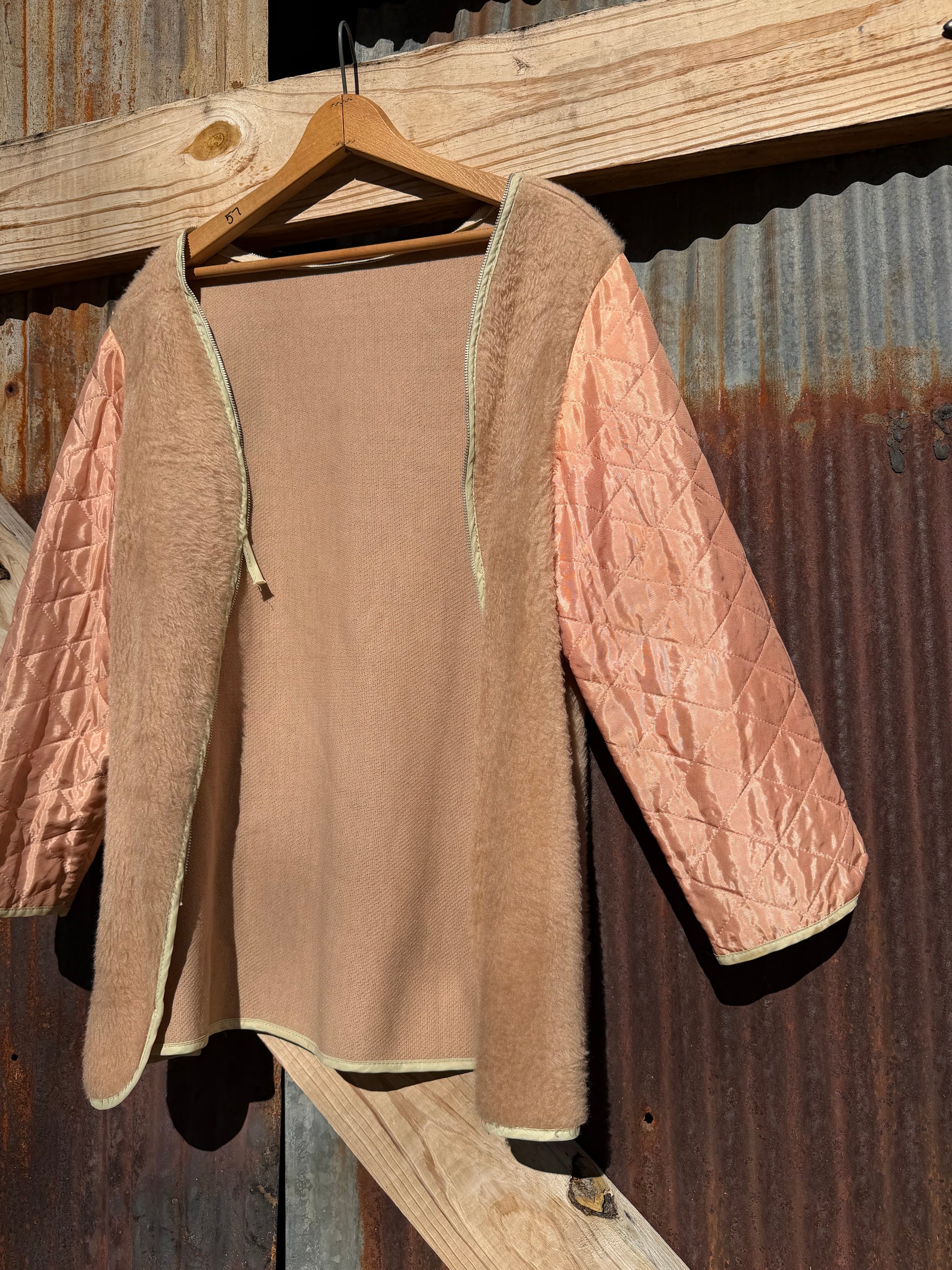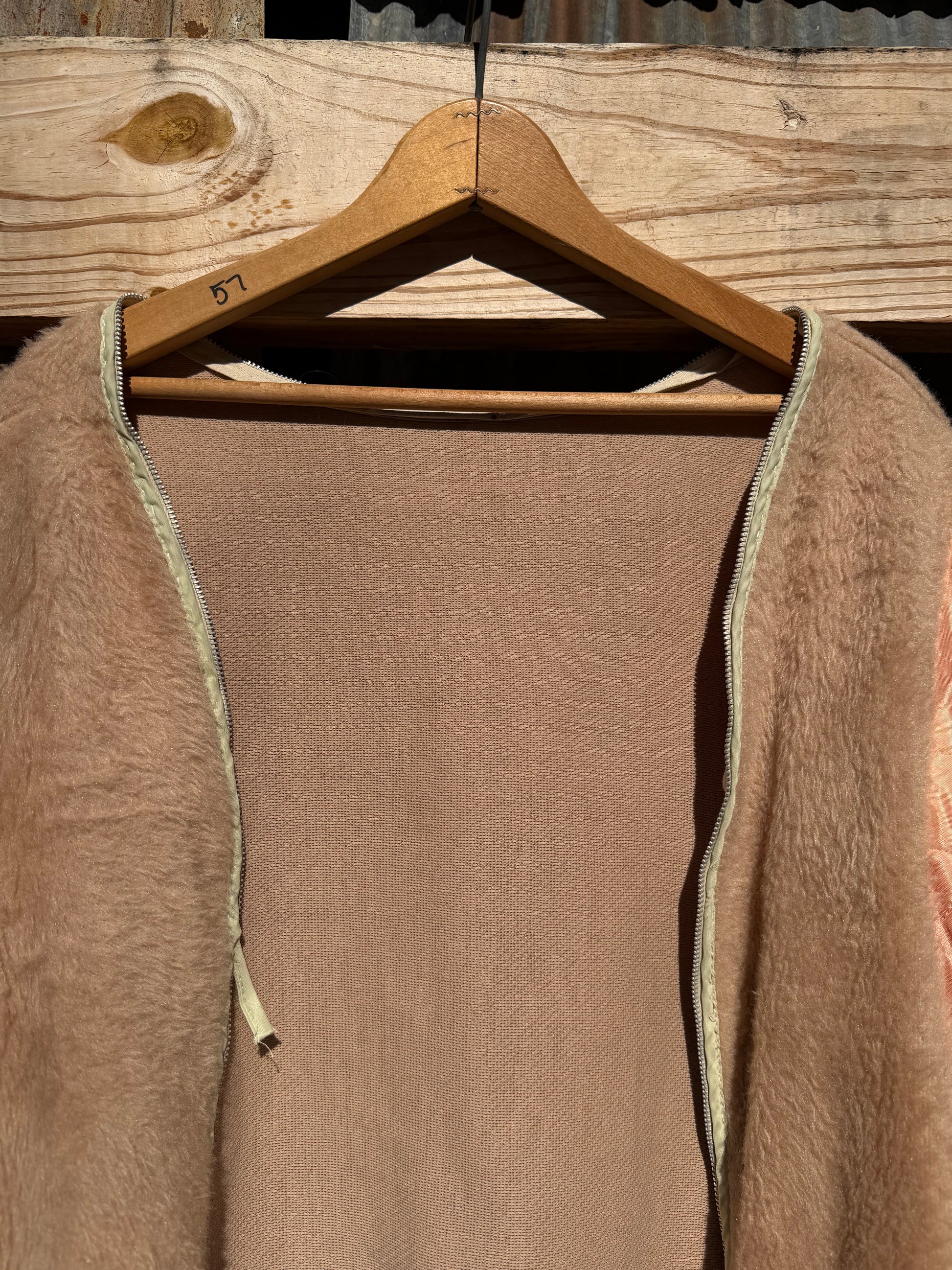 Champagne pink liner with a faux fur. Zipper doesn't work but could easily be fixed. Super special one.