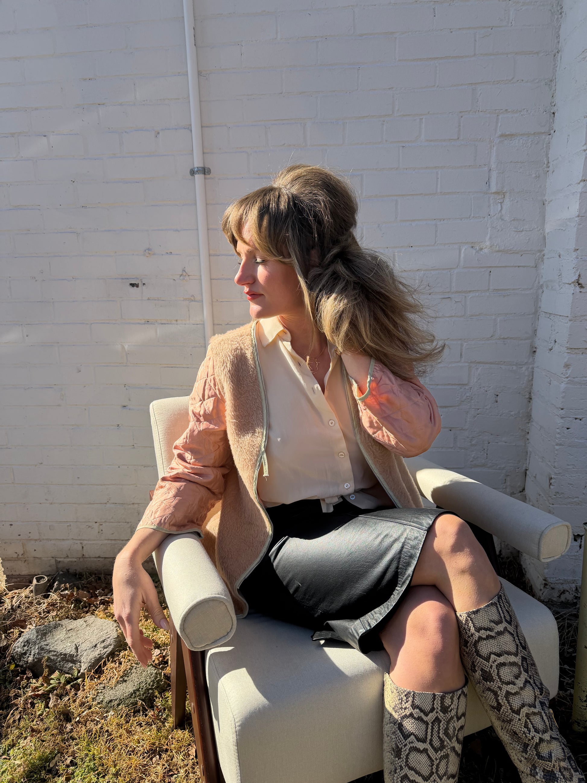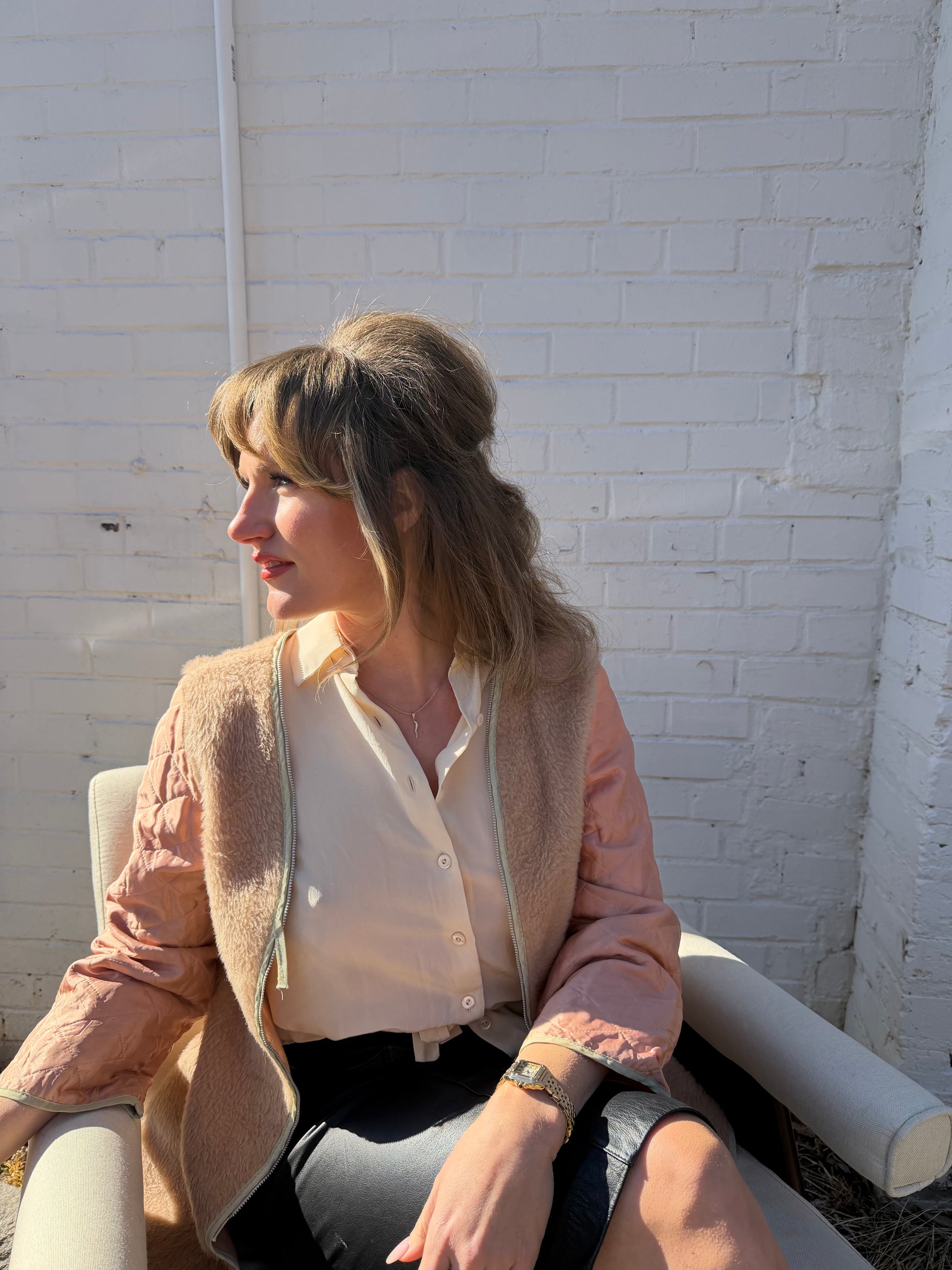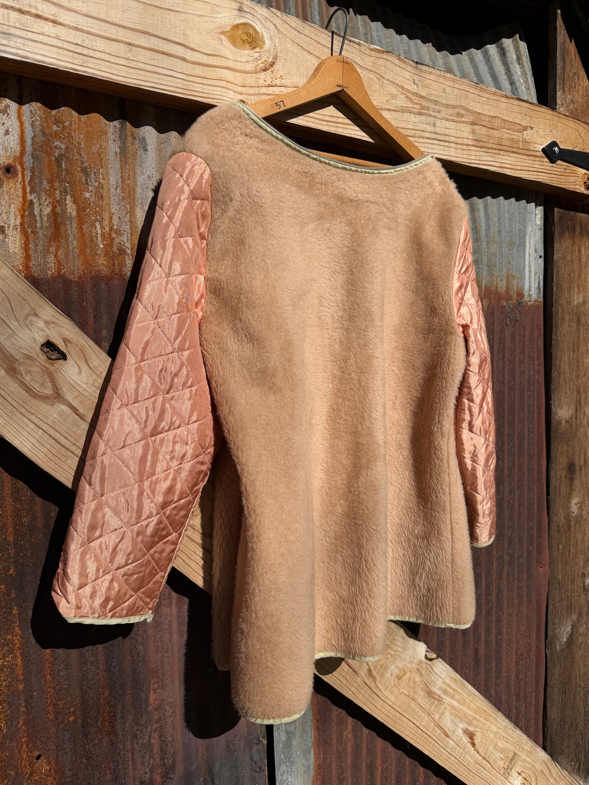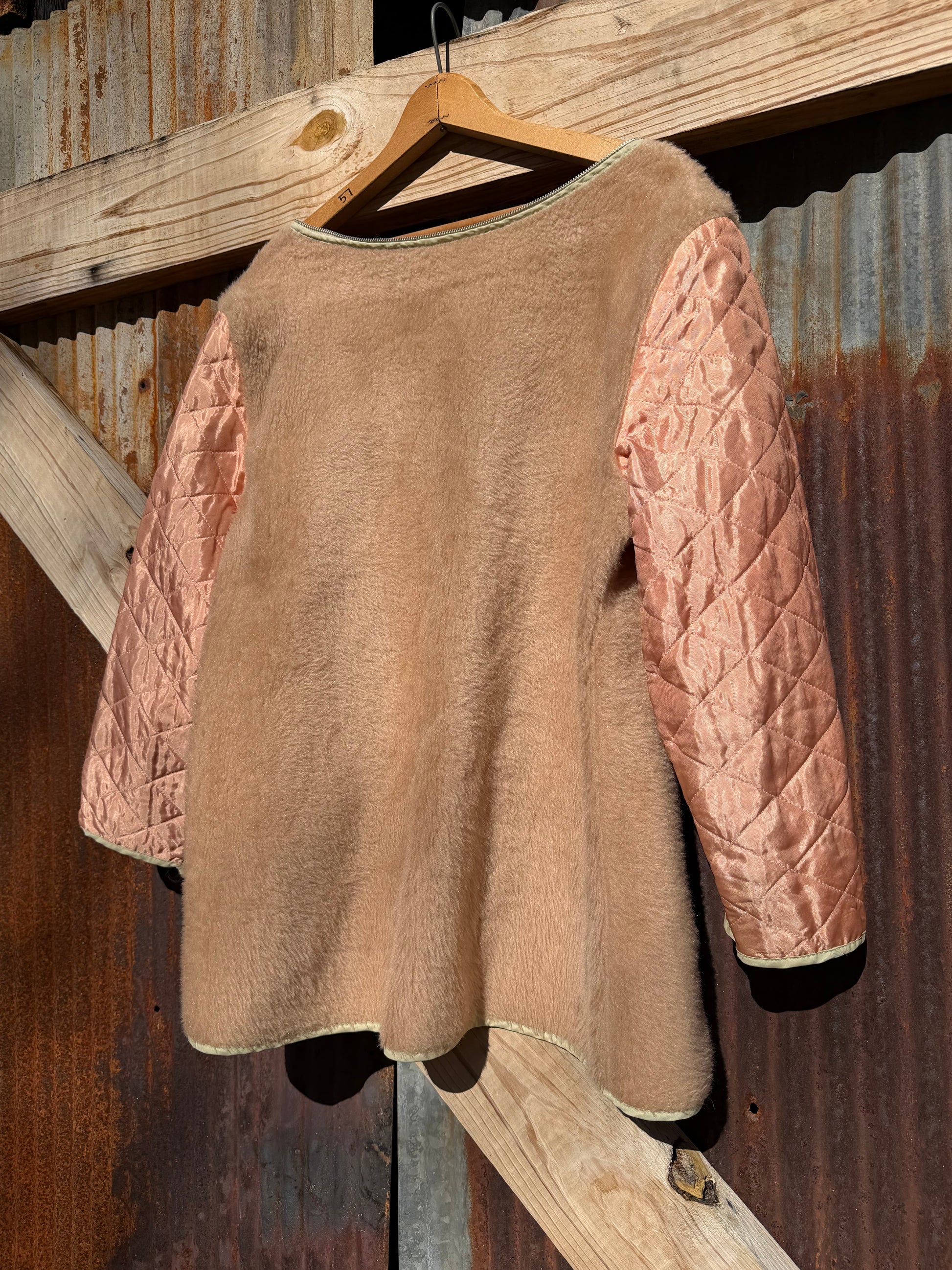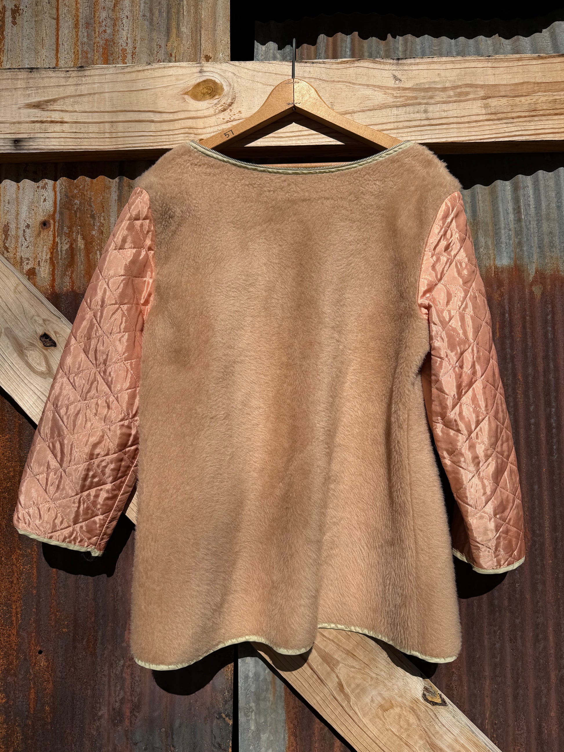 Champagne pink liner with a faux fur. Zipper doesn't work but could easily be fixed. Super special one.