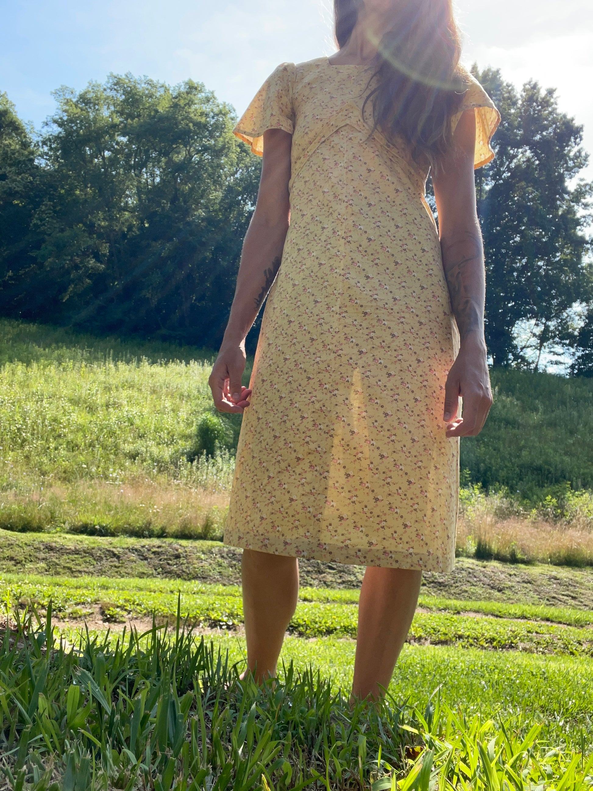 A beautiful handmade cotton floral dress with a tie that goes underneath the bust and ties in the back. Flutter sleeves.