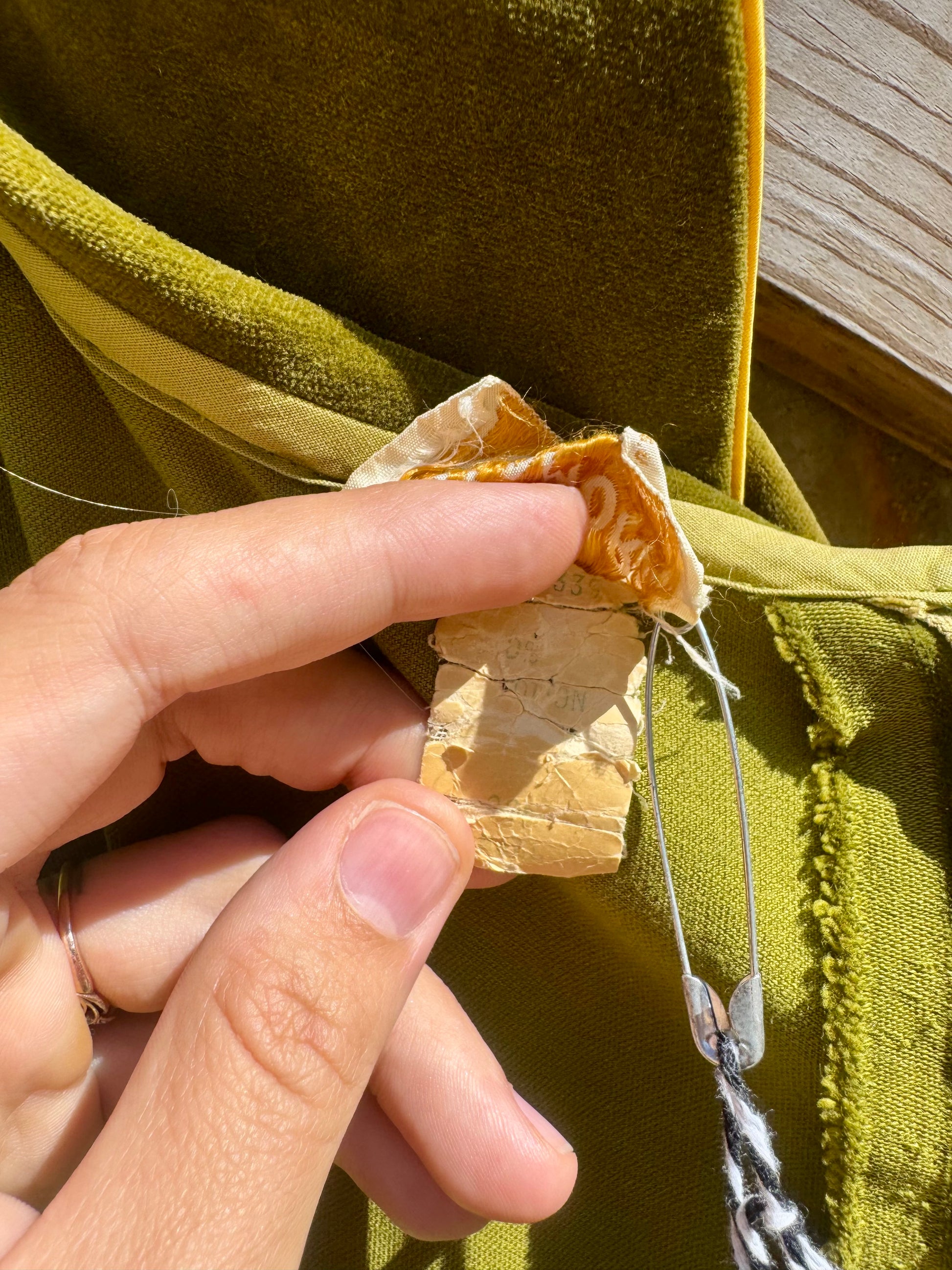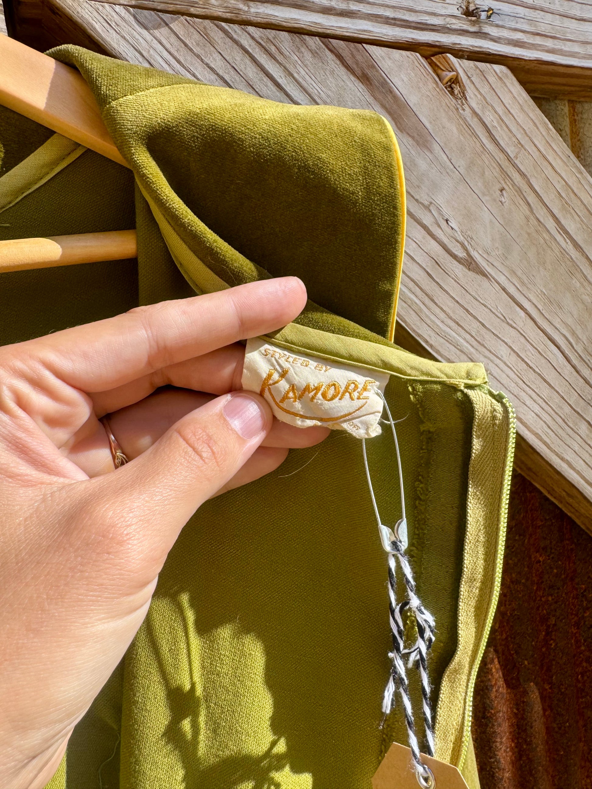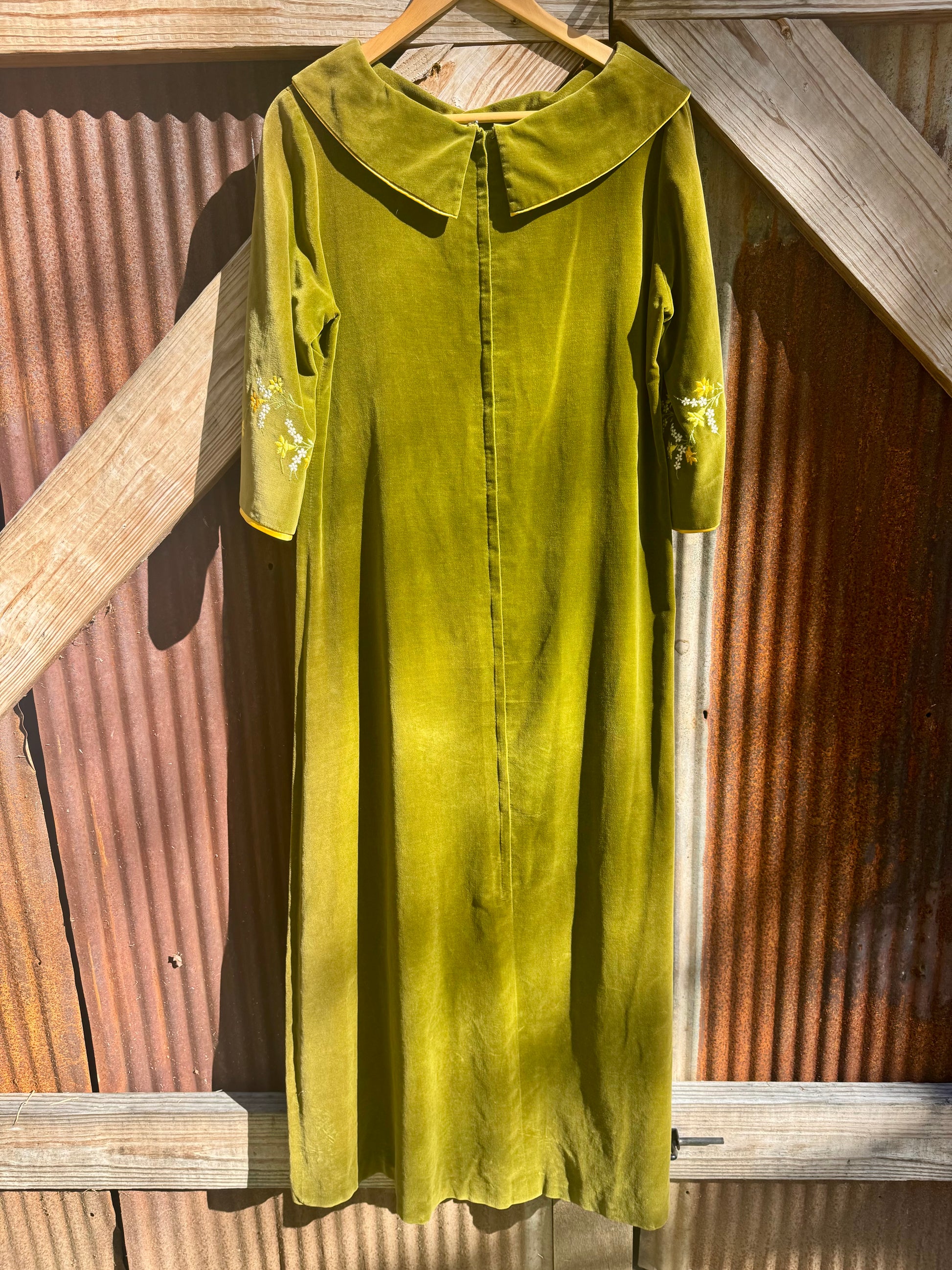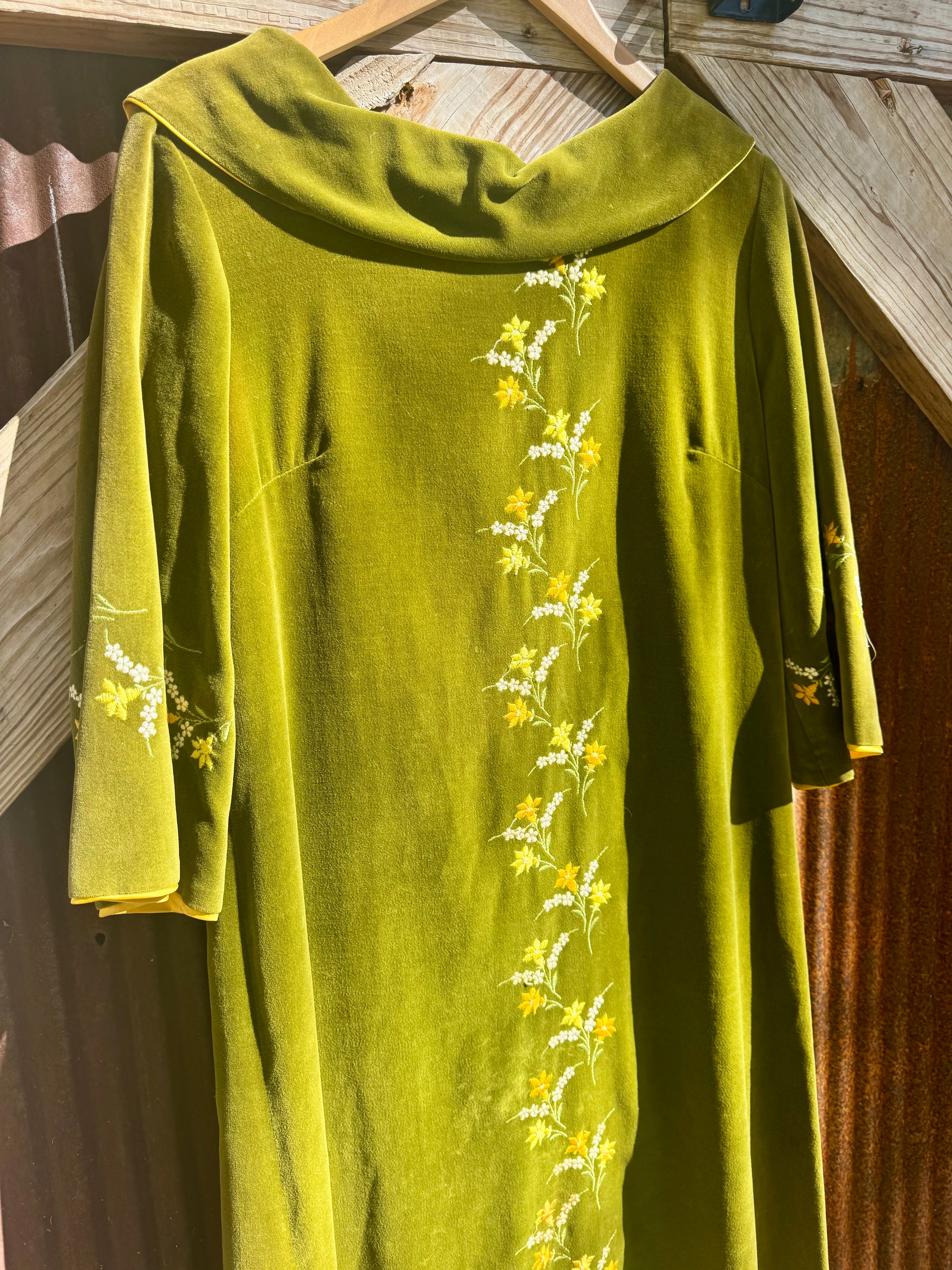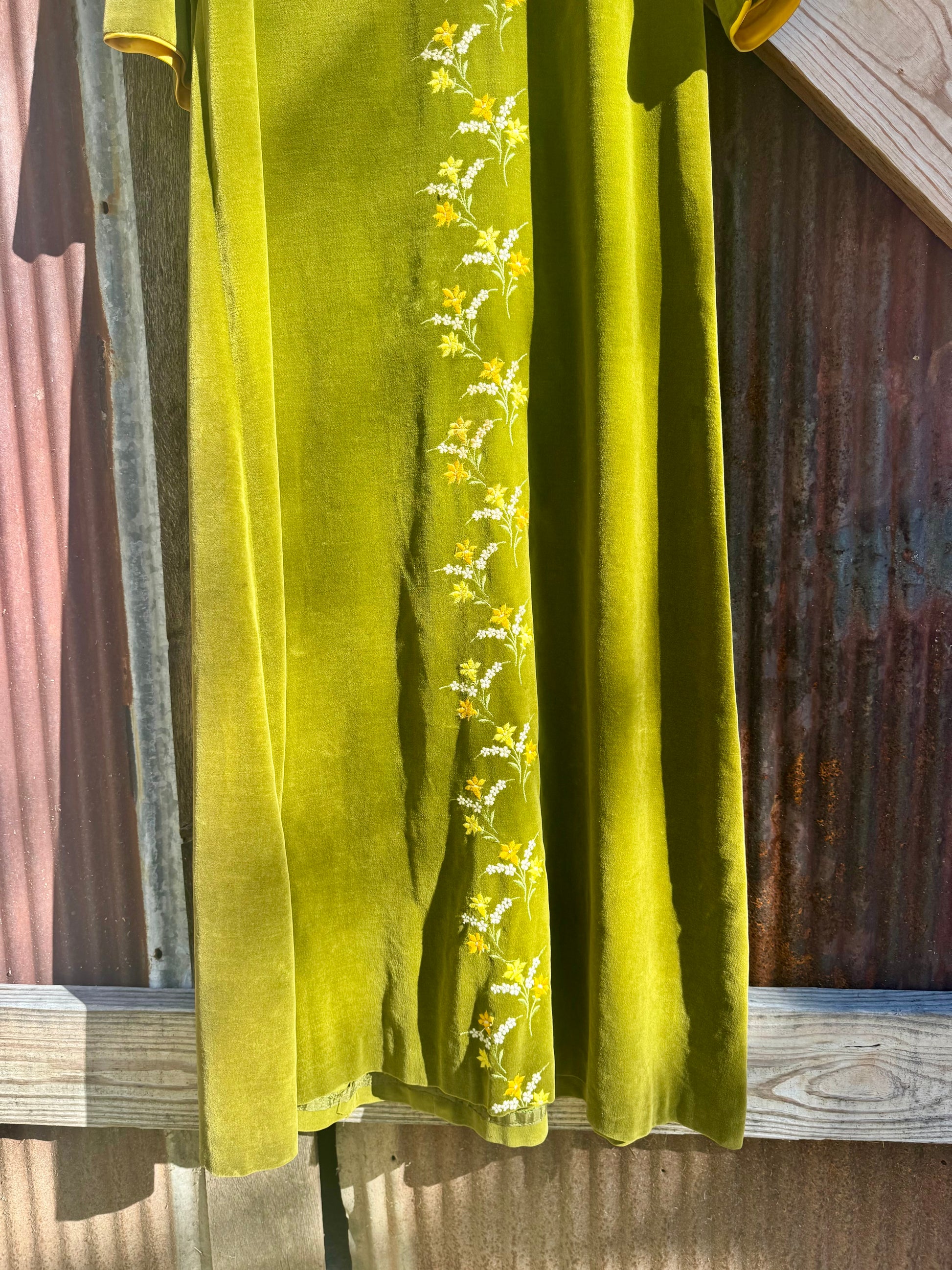 Absolutely stunning 60/70s Kamore cotton velvet dress. Florals embroidered down the center of the front and on sleeves. 3/4 length sleeves are meant to be cuffed highlighting the gorgeous golden satin underneath.
