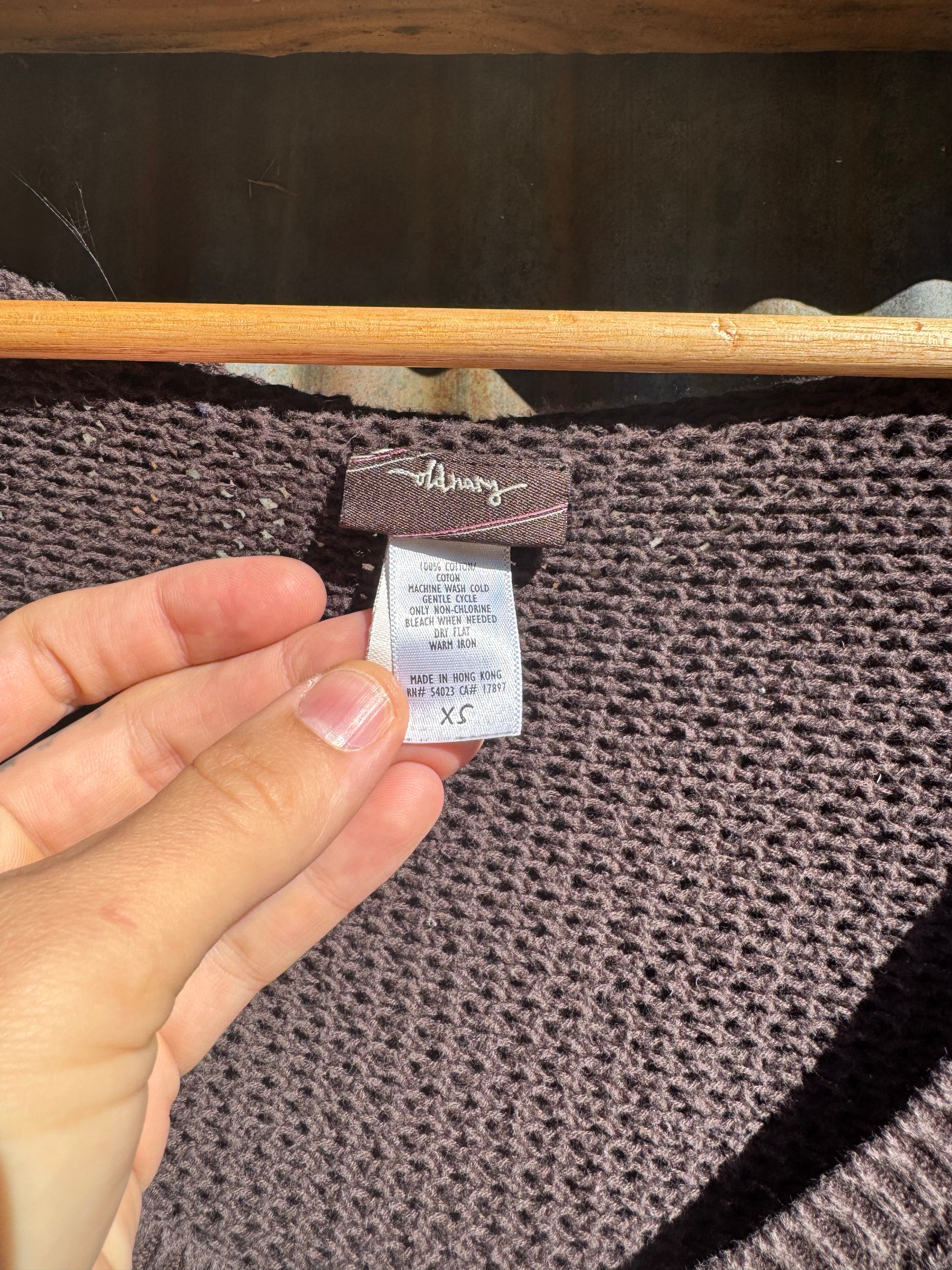 Brown knit vintage old navy knit top with hood. Has two little holds for a belt on the sides if you want to add some sort of string to tie around waist. Tagged an XS.