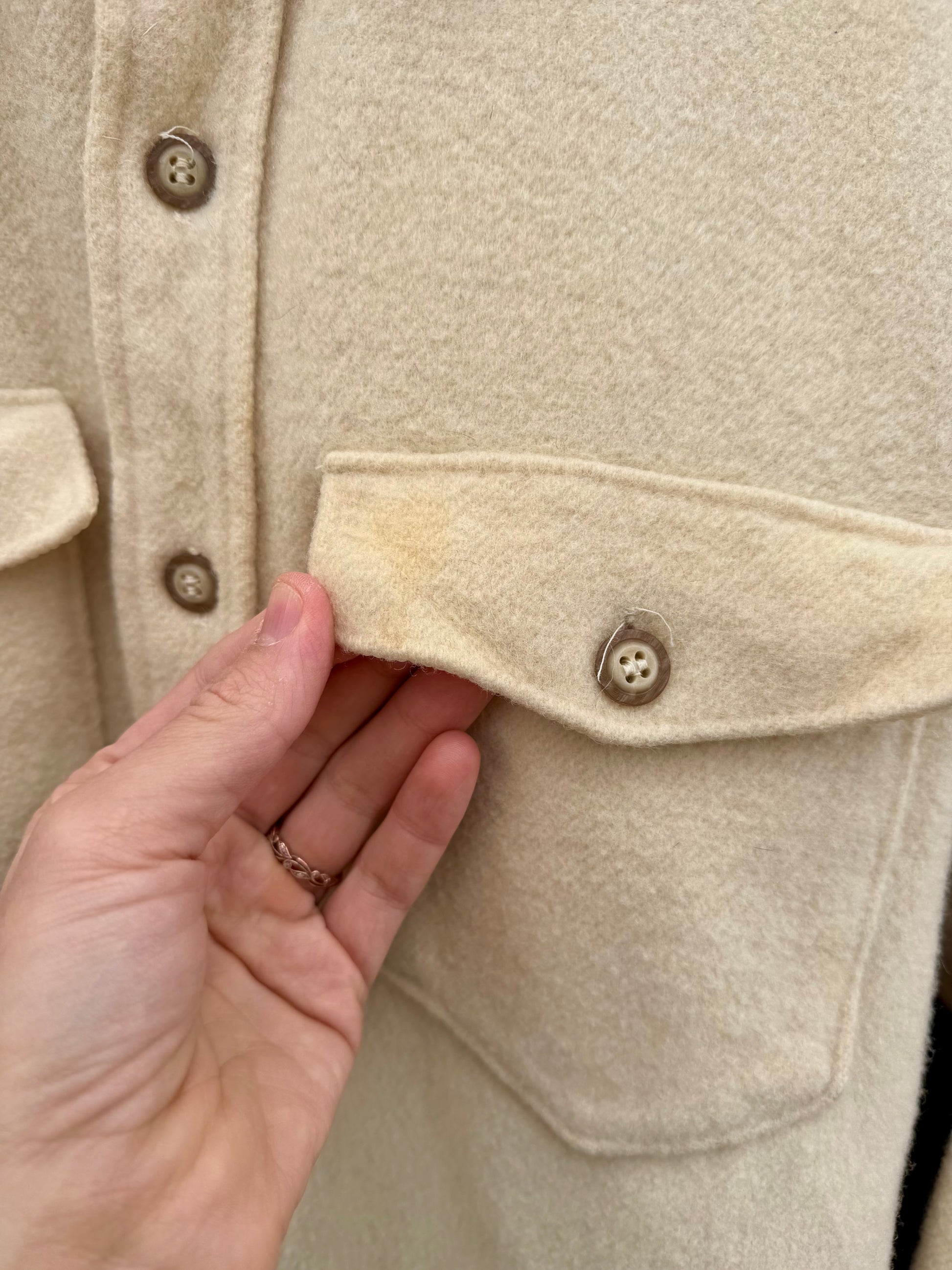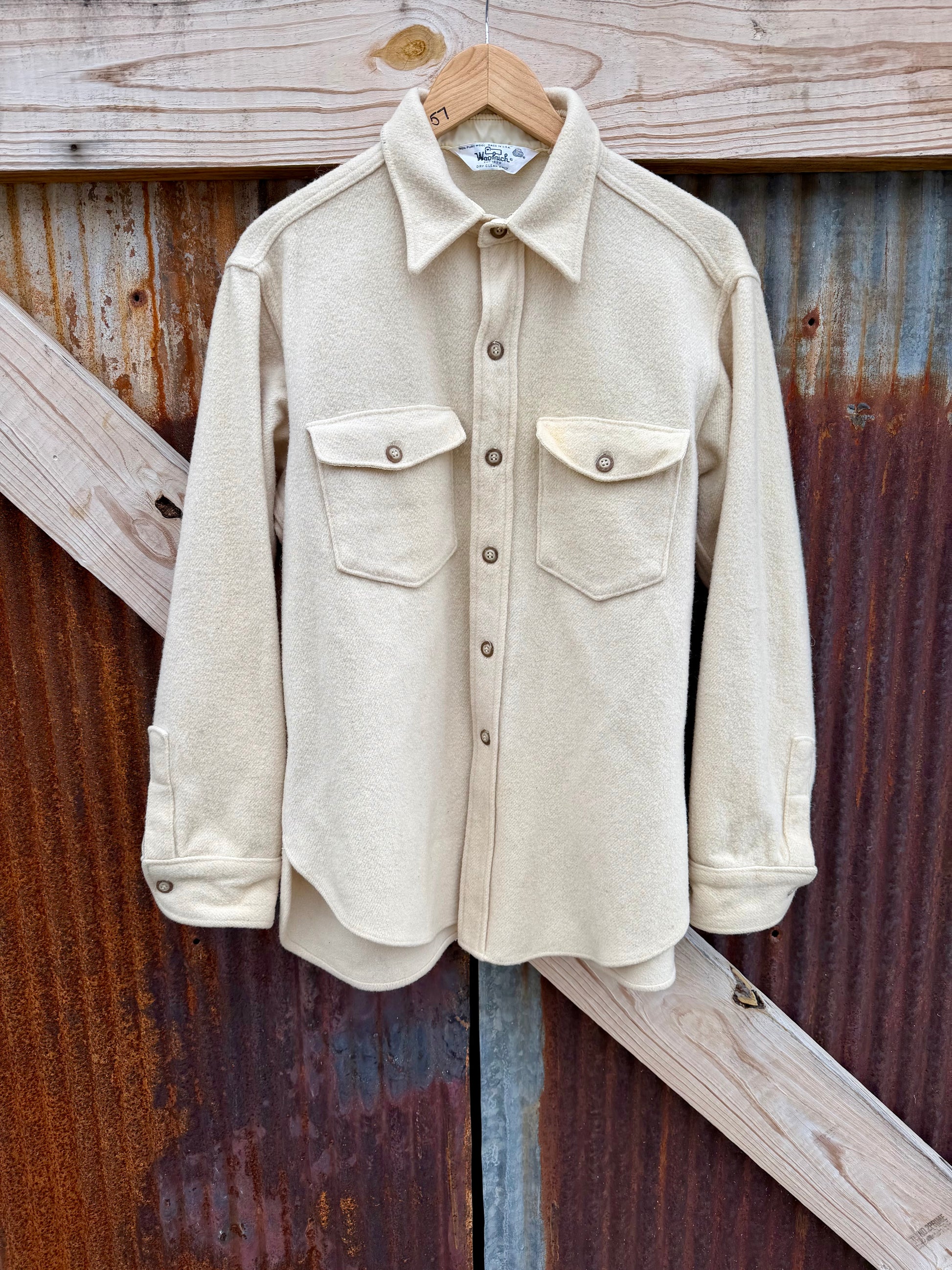 Creamy 1960s Woolrich flannel in cream. Button down front with two chest pockets. 100% wool. Made in the USA Tagged a large